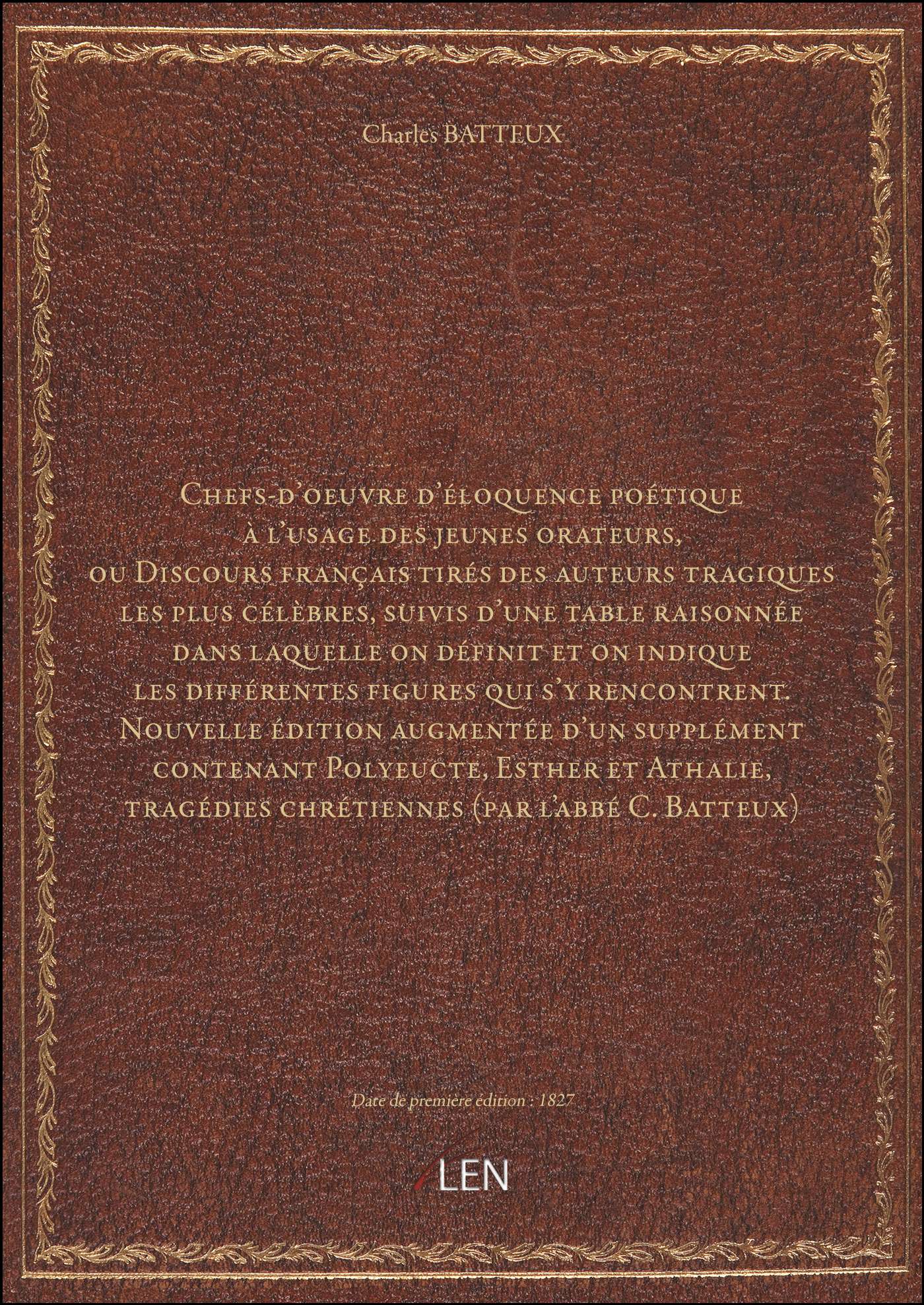 Titre complet : Chefs-d'oeuvre d'éloquence poétique à l'usage des jeunes orateurs, ou Discours français tirés des auteurs tragiques les plus célèbres, suivis d'une table raisonnée dans laquelle on définit et on indique les différentes figures qui s'y rencontrent. Nouvelle édition augmentée d'un supplément contenant Polyeucte, Esther et Athalie, tragédies chrétiennes (par l'abbé C. Batteux)