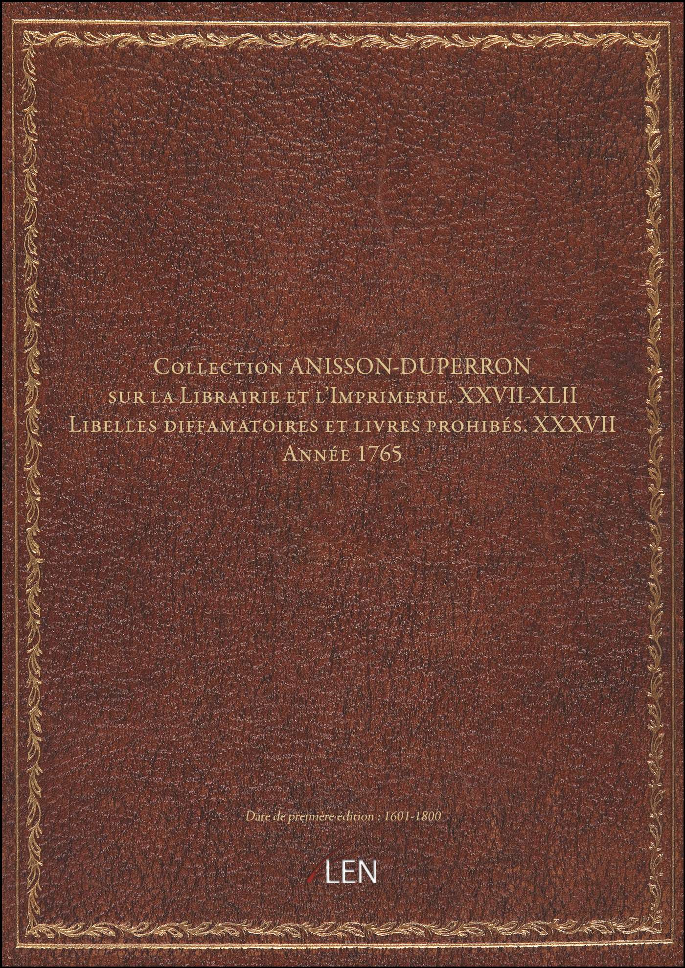 Titre complet : Collection ANISSON-DUPERRON sur la Librairie et l'Imprimerie. XXVII-XLII Libelles diffamatoires et livres prohibés. XXXVII Année 1765