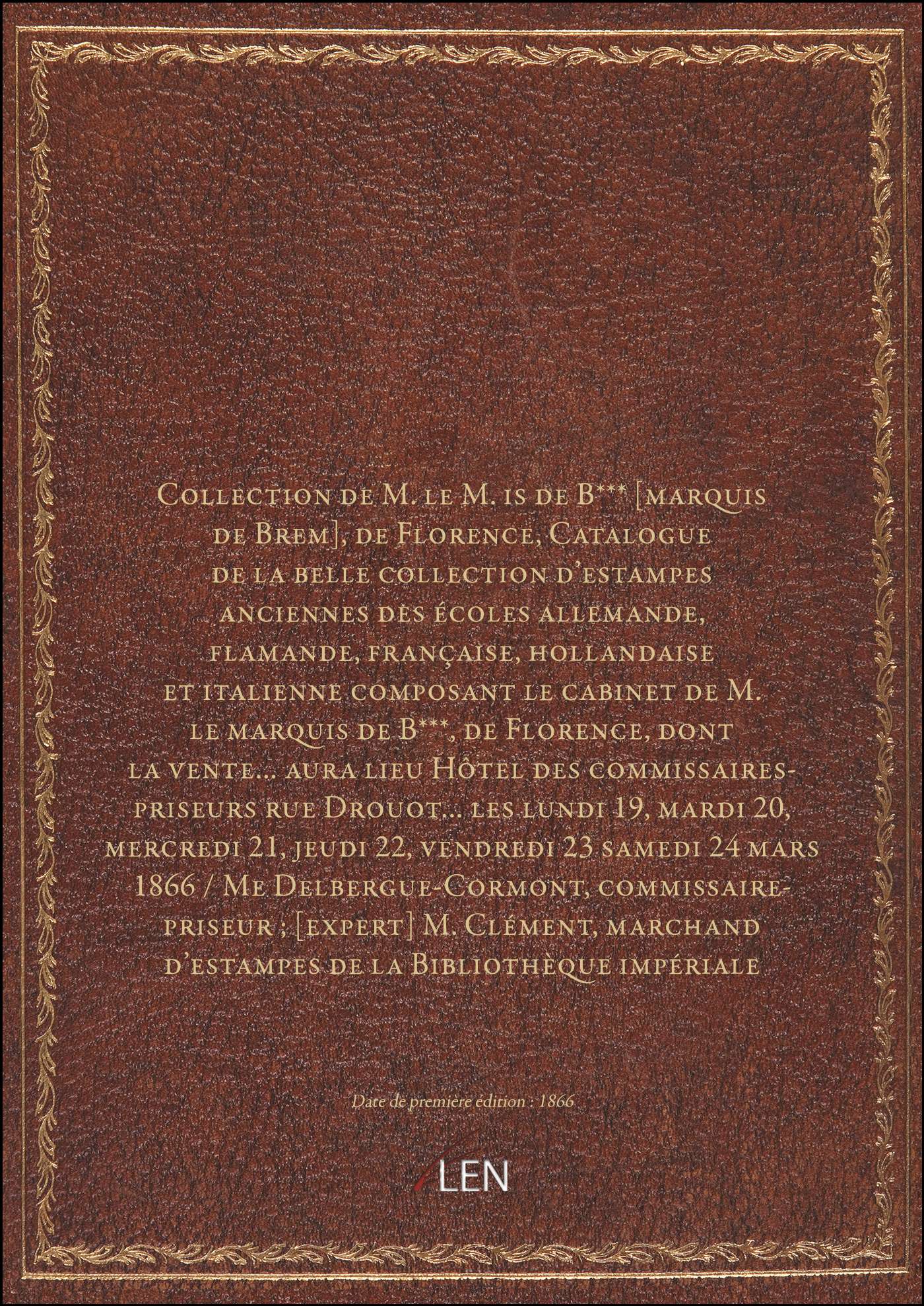 Titre complet : Collection de M. le M.is de B*** [marquis de Brem], de Florence, Catalogue de la belle collection d'estampes anciennes des écoles allemande, flamande, française, hollandaise et italienne composant le cabinet de M. le marquis de B***, de Florence, dont la vente... aura lieu Hôtel des commissaires-priseurs rue Drouot... les lundi 19, mardi 20, mercredi 21, jeudi 22, vendredi 23 samedi 24 mars 1866 / Me Delbergue-Cormont, commissaire-priseur ; [expert] M. Clément, marchand d'estampes de la Bibliothèque impériale