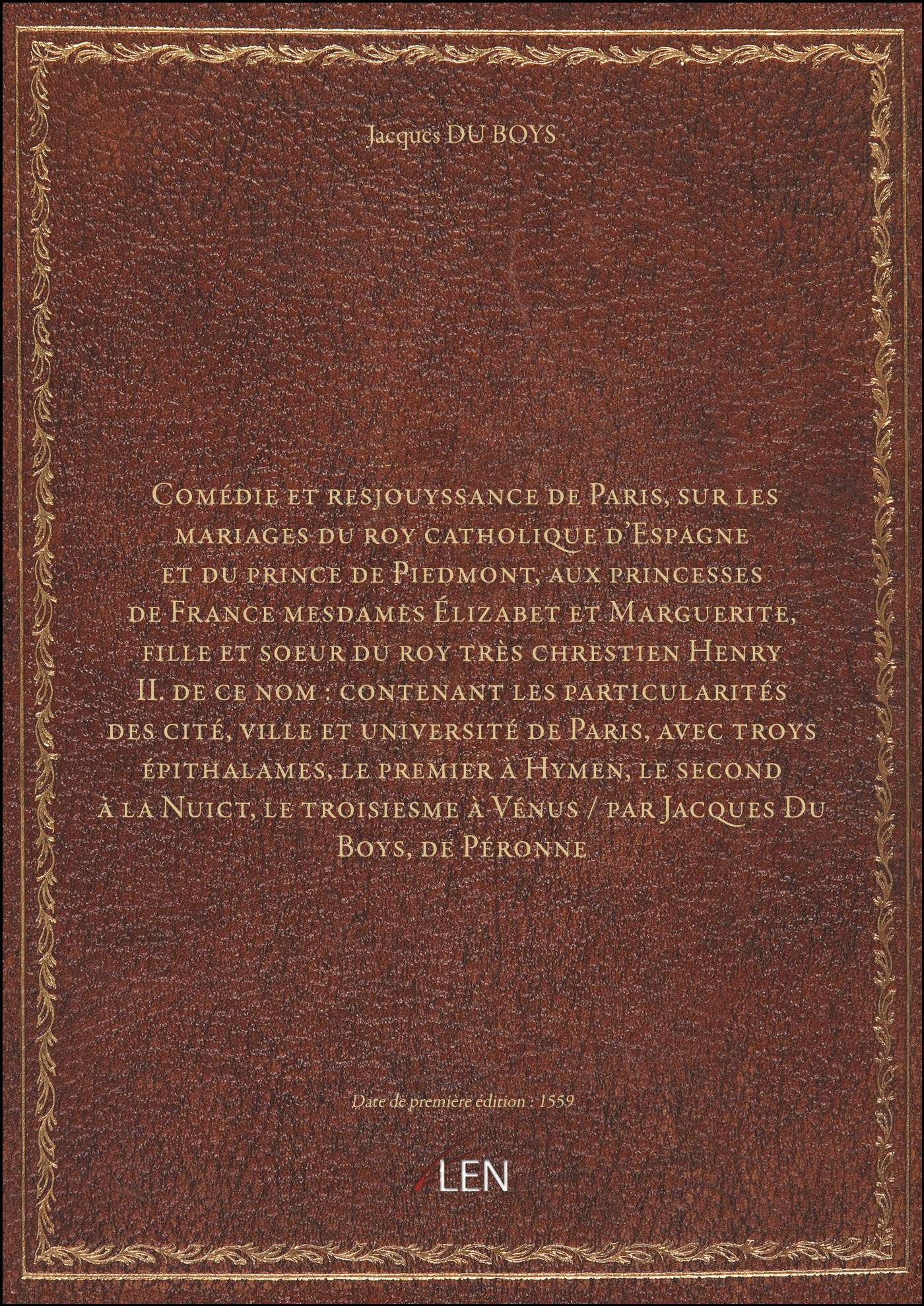 Titre complet : Comédie et resjouyssance de Paris, sur les mariages du roy catholique d'Espagne et du prince de Piedmont, aux princesses de France mesdames Élizabet et Marguerite, fille et soeur du roy très chrestien Henry II. de ce nom : contenant les particularités des cité, ville et université de Paris, avec troys épithalames, le premier à Hymen, le second à la Nuict, le troisiesme à Vénus / par Jacques Du Boys, de Péronne