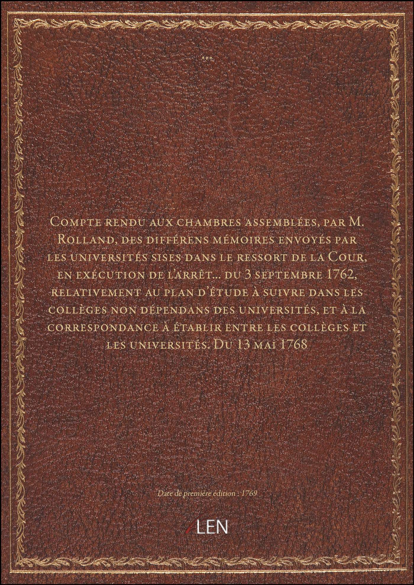 Titre complet : Compte rendu aux chambres assemblées, par M. Rolland, des différens mémoires envoyés par les universités sises dans le ressort de la Cour, en exécution de l'arrêt... du 3 septembre 1762, relativement au plan d'étude à suivre dans les collèges non dépendans des universités, et à la correspondance à établir entre les collèges et les universités. Du 13 mai 1768