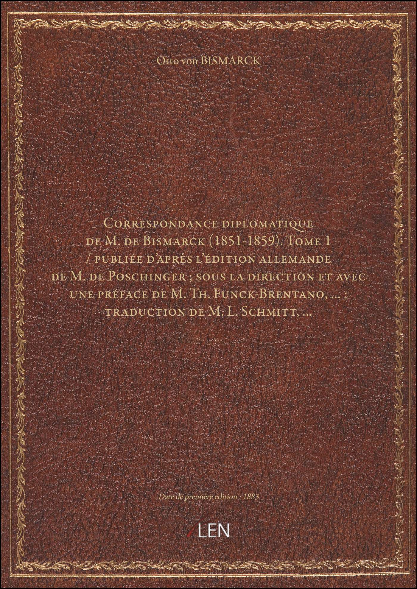 Titre complet : Correspondance diplomatique de M. de Bismarck (1851-1859). Tome 1 / publiée d'après l'édition allemande de M. de Poschinger ; sous la direction et avec une préface de M. Th. Funck-Brentano,... ; traduction de M. L. Schmitt,...