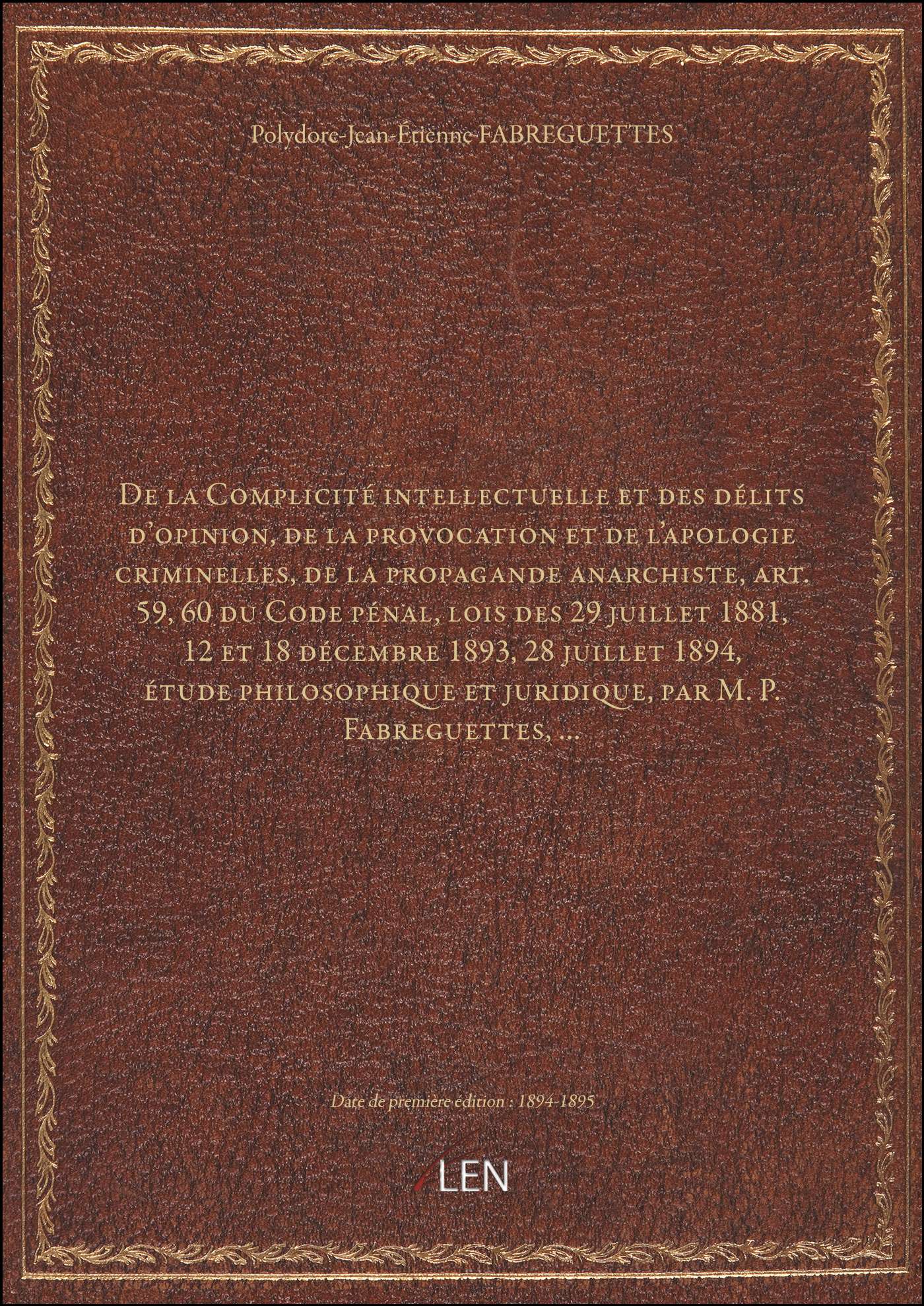 Titre complet : De la Complicité intellectuelle et des délits d'opinion, de la provocation et de l'apologie criminelles, de la propagande anarchiste, art. 59, 60 du Code pénal, lois des 29 juillet 1881, 12 et 18 décembre 1893, 28 juillet 1894, étude philosophique et juridique, par M. P. Fabreguettes,...