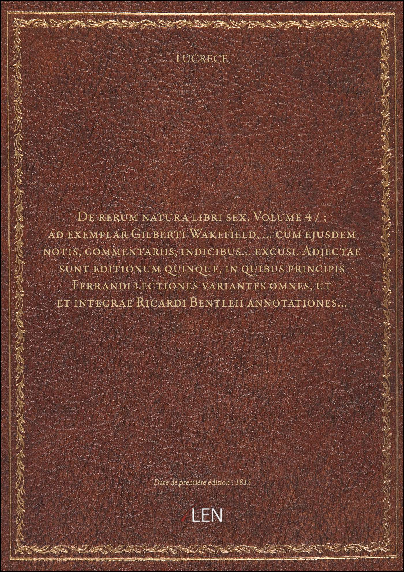 Titre complet : De rerum natura libri sex. Volume 4 / ; ad exemplar Gilberti Wakefield,... cum ejusdem notis, commentariis, indicibus... excusi. Adjectae sunt editionum quinque, in quibus principis Ferrandi lectiones variantes omnes, ut et integrae Ricardi Bentleii annotationes...