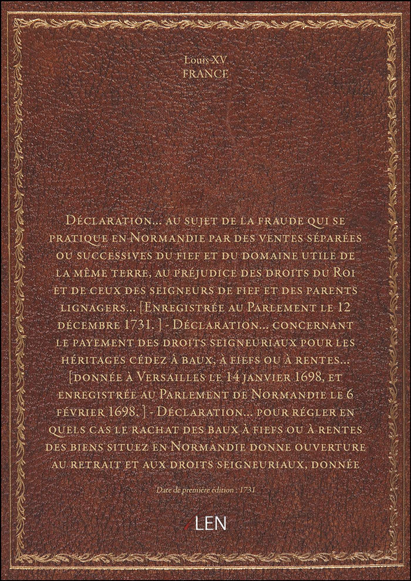 Titre complet : Déclaration... au sujet de la fraude qui se pratique en Normandie par des ventes séparées ou successives du fief et du domaine utile de la même terre, au préjudice des droits du Roi et de ceux des seigneurs de fief et des parents lignagers... [Enregistrée au Parlement le 12 décembre 1731.] - Déclaration... concernant le payement des droits seigneuriaux pour les héritages cédez à baux, à fiefs ou à rentes... [donnée à Versailles le 14 janvier 1698, et enregistrée au Parlement de Normandie le 6 février 1698.] - Déclaration... pour régler en quels cas le rachat des baux à fiefs ou à rentes des biens situez en Normandie donne ouverture au retrait et aux droits seigneuriaux, donnée à Versailles le 10 janvier 1725. [Enregistrée au Parlement de Normandie le 26 janvier 1725.] - Déclaration... au sujet des rachats de partie des baux à fiefs ou à rentes en Normandie... donnée à Versailles le 26 mai 1725. [Enregistrée au Parlement de Normandie le 12 juin 1725.]