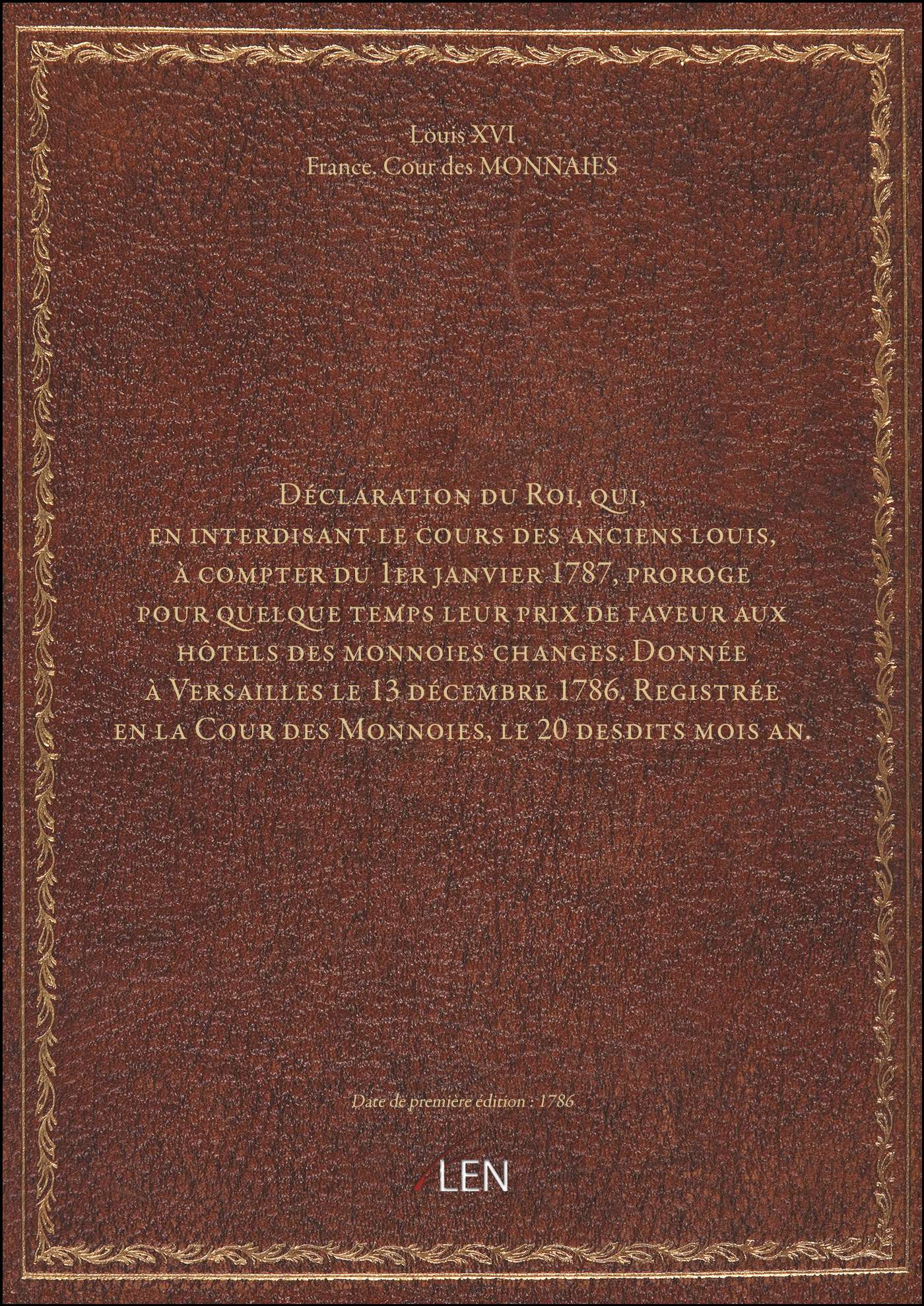 Titre complet : Déclaration du Roi, qui, en interdisant le cours des anciens louis, à compter du 1er janvier 1787, proroge pour quelque temps leur prix de faveur aux hôtels des monnoies changes . Donnée à Versailles le 13 décembre 1786. Registrée en la Cour des Monnoies, le 20 desdits mois an.