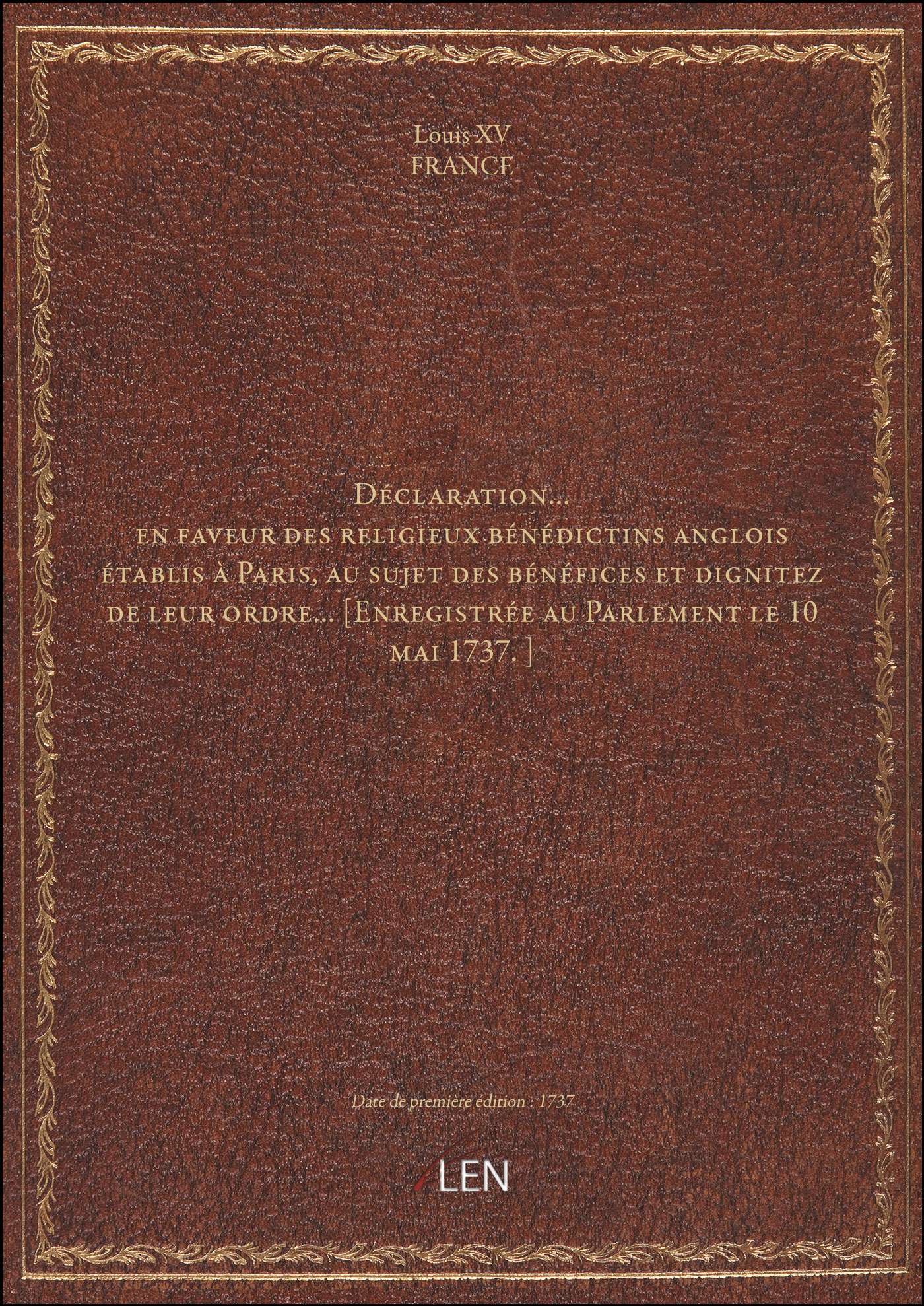 Titre complet : Déclaration... en faveur des religieux bénédictins anglois établis à Paris, au sujet des bénéfices et dignitez de leur ordre... [Enregistrée au Parlement le 10 mai 1737.]