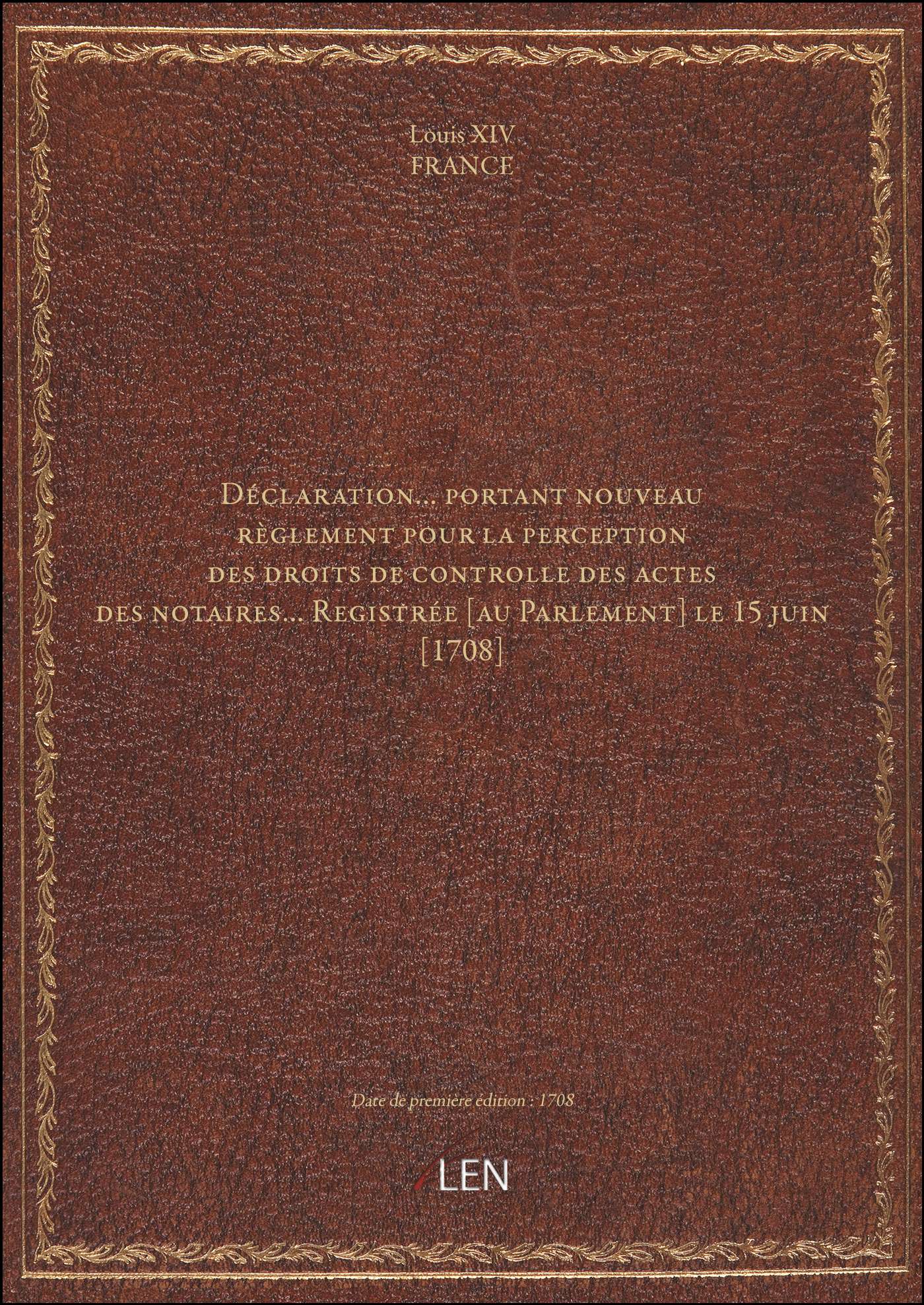 Titre complet : Déclaration... portant nouveau règlement pour la perception des droits de controlle des actes des notaires... Registrée [au Parlement] le 15 juin [1708]