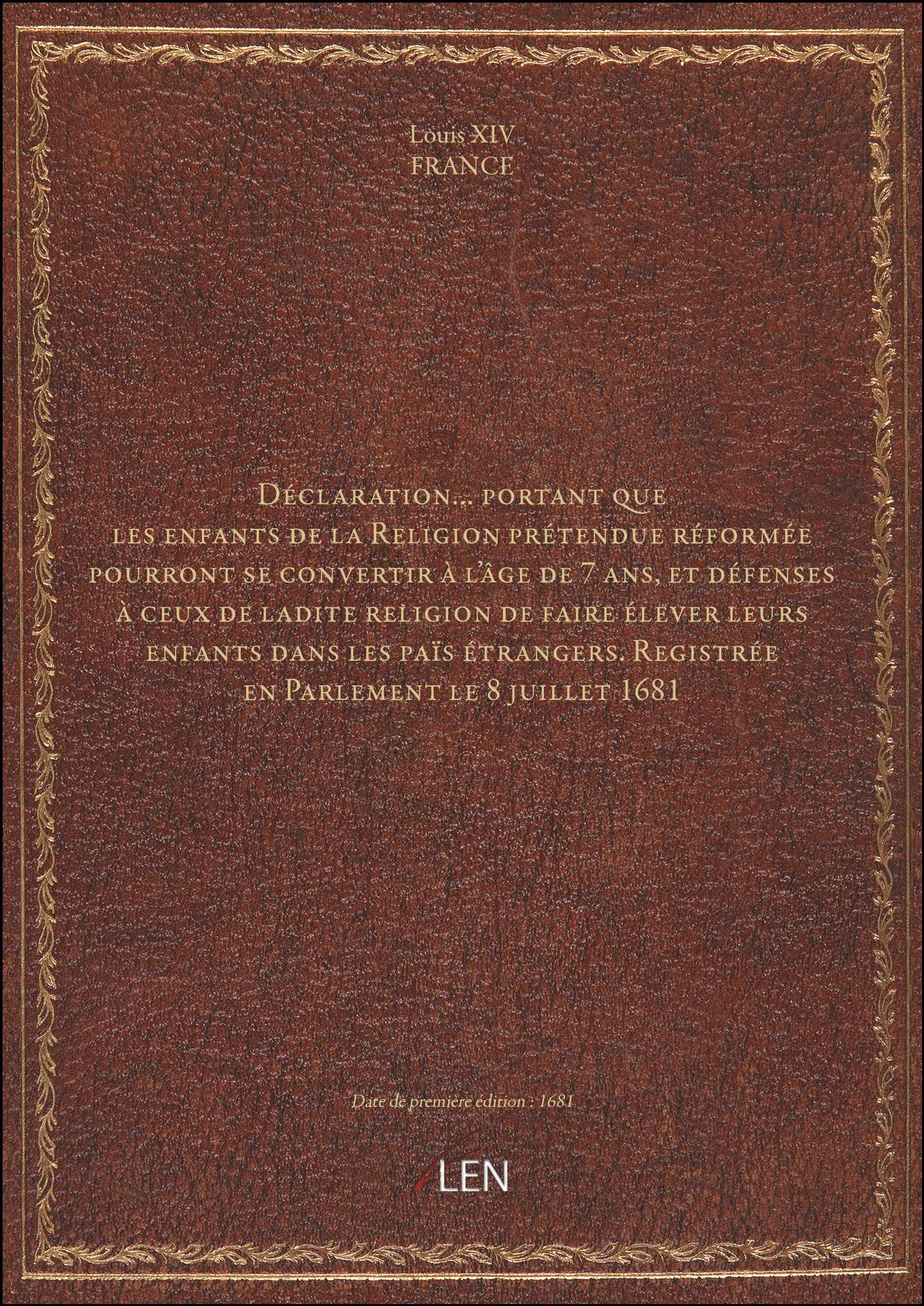 Titre complet : Déclaration... portant que les enfants de la Religion prétendue réformée pourront se convertir à l'âge de 7 ans, et défenses à ceux de ladite religion de faire élever leurs enfants dans les païs étrangers. Registrée en Parlement le 8 juillet 1681