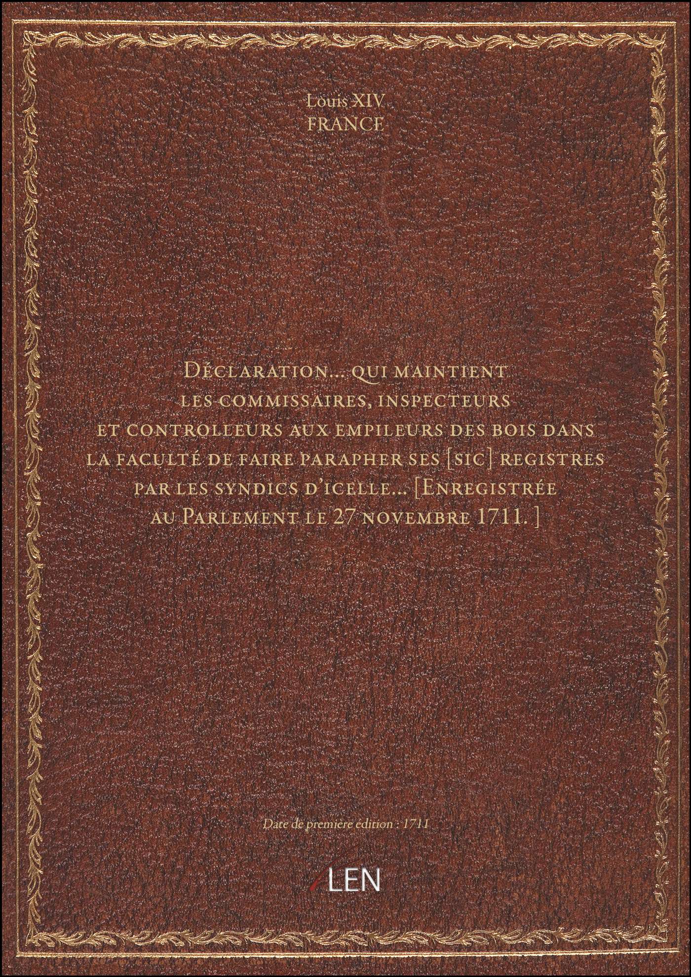 Déclaration... qui maintient les commissaires, inspecteurs et controlleurs aux empileurs des bois dans la faculté de faire parapher ses [sic] registres par les syndics d'icelle... [Enregistrée au Parlement le 27 novembre 1711.]