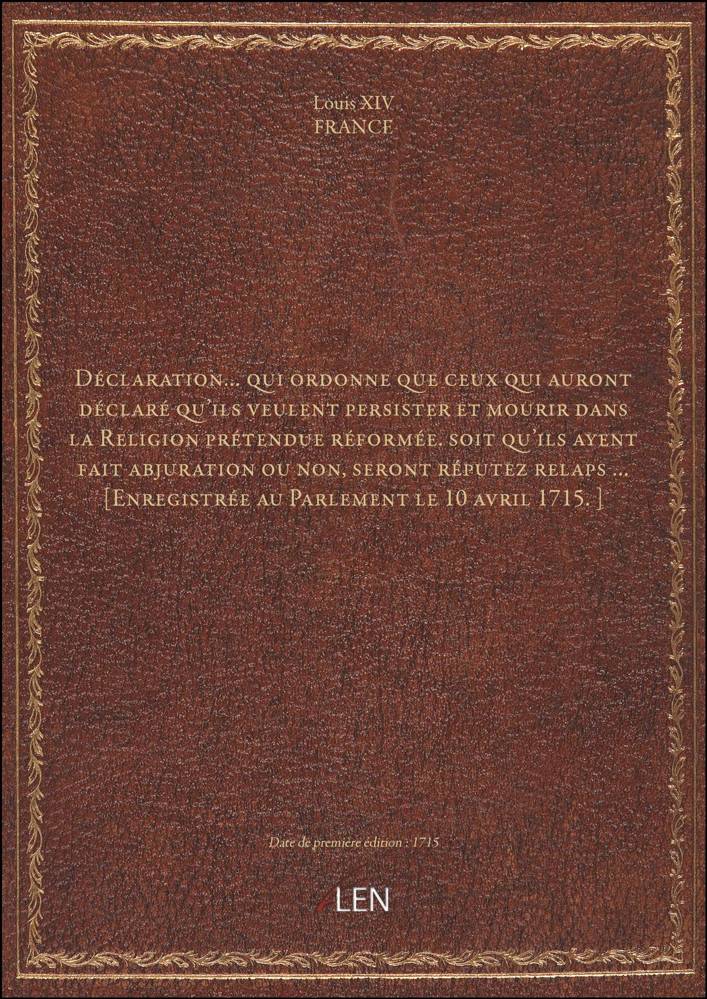 Déclaration... qui ordonne que ceux qui auront déclaré qu'ils veulent persister et mourir dans la Religion prétendue réformée. soit qu'ils ayent fait abjuration ou non, seront réputez relaps ... [Enregistrée au Parlement le 10 avril 1715.]
