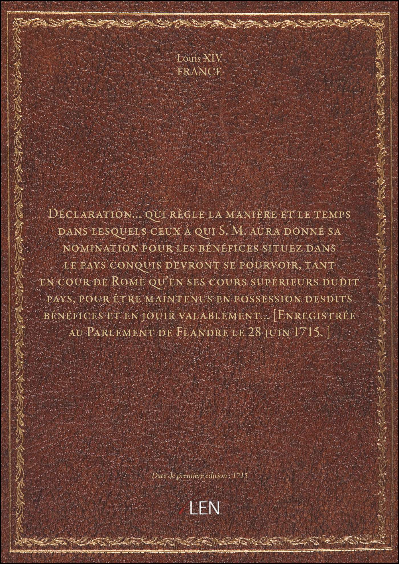 Titre complet : Déclaration... qui règle la manière et le temps dans lesquels ceux à qui S. M. aura donné sa nomination pour les bénéfices situez dans le pays conquis devront se pourvoir, tant en cour de Rome qu'en ses cours supérieurs dudit pays, pour être maintenus en possession desdits bénéfices et en jouir valablement... [Enregistrée au Parlement de Flandre le 28 juin 1715.]