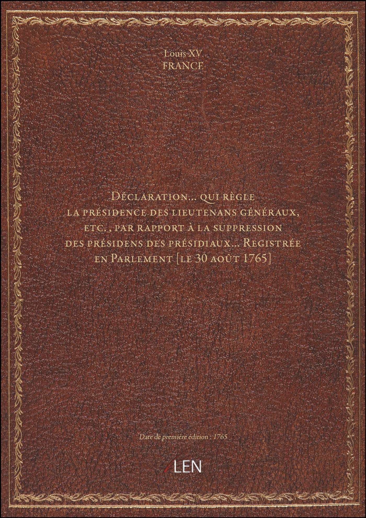 Titre complet : Déclaration... qui règle la présidence des lieutenans généraux, etc., par rapport à la suppression des présidens des présidiaux... Registrée en Parlement [le 30 août 1765]