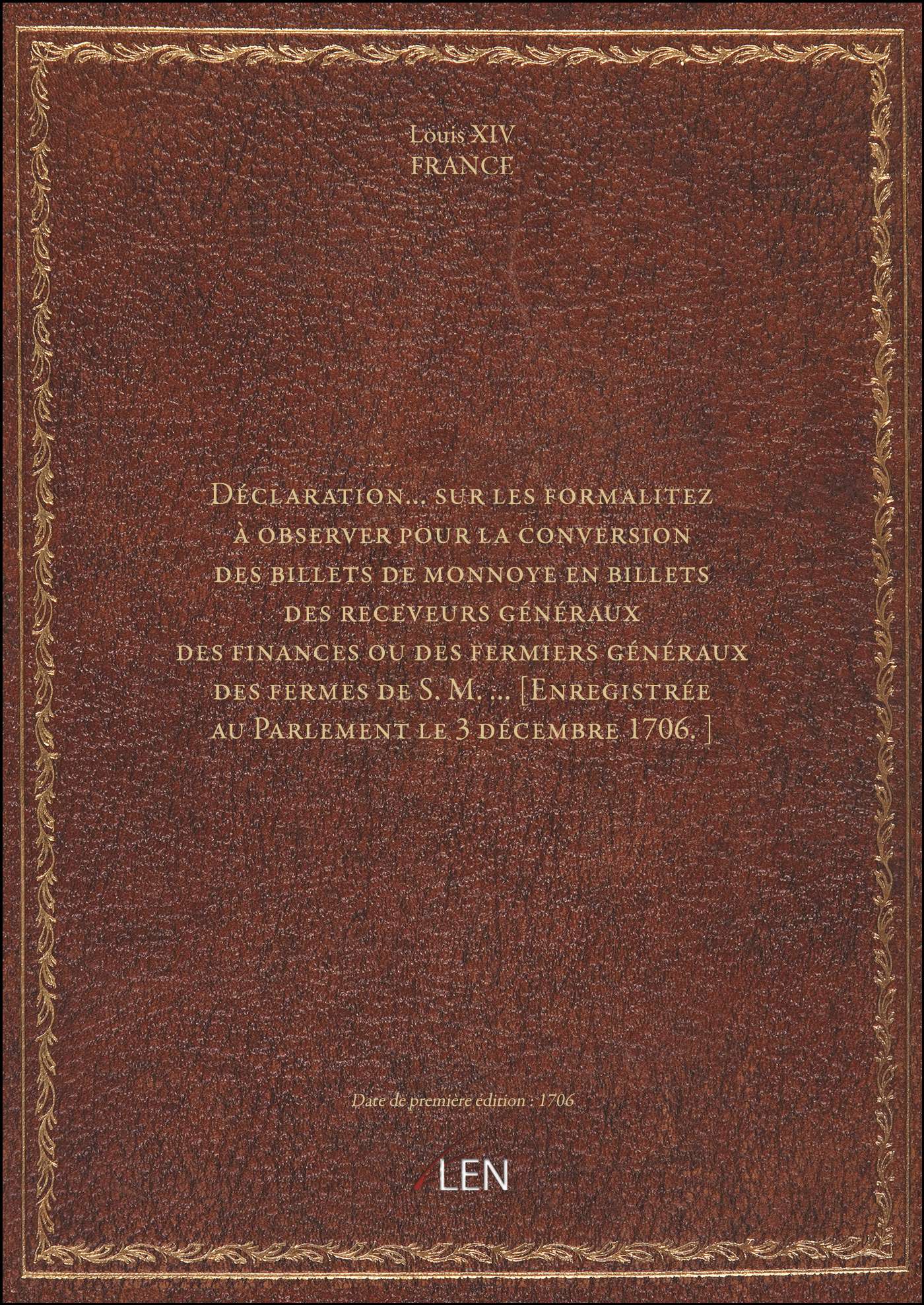 Titre complet : Déclaration... sur les formalitez à observer pour la conversion des billets de monnoye en billets des receveurs généraux des finances ou des fermiers généraux des fermes de S. M. ... [Enregistrée au Parlement le 3 décembre 1706.]