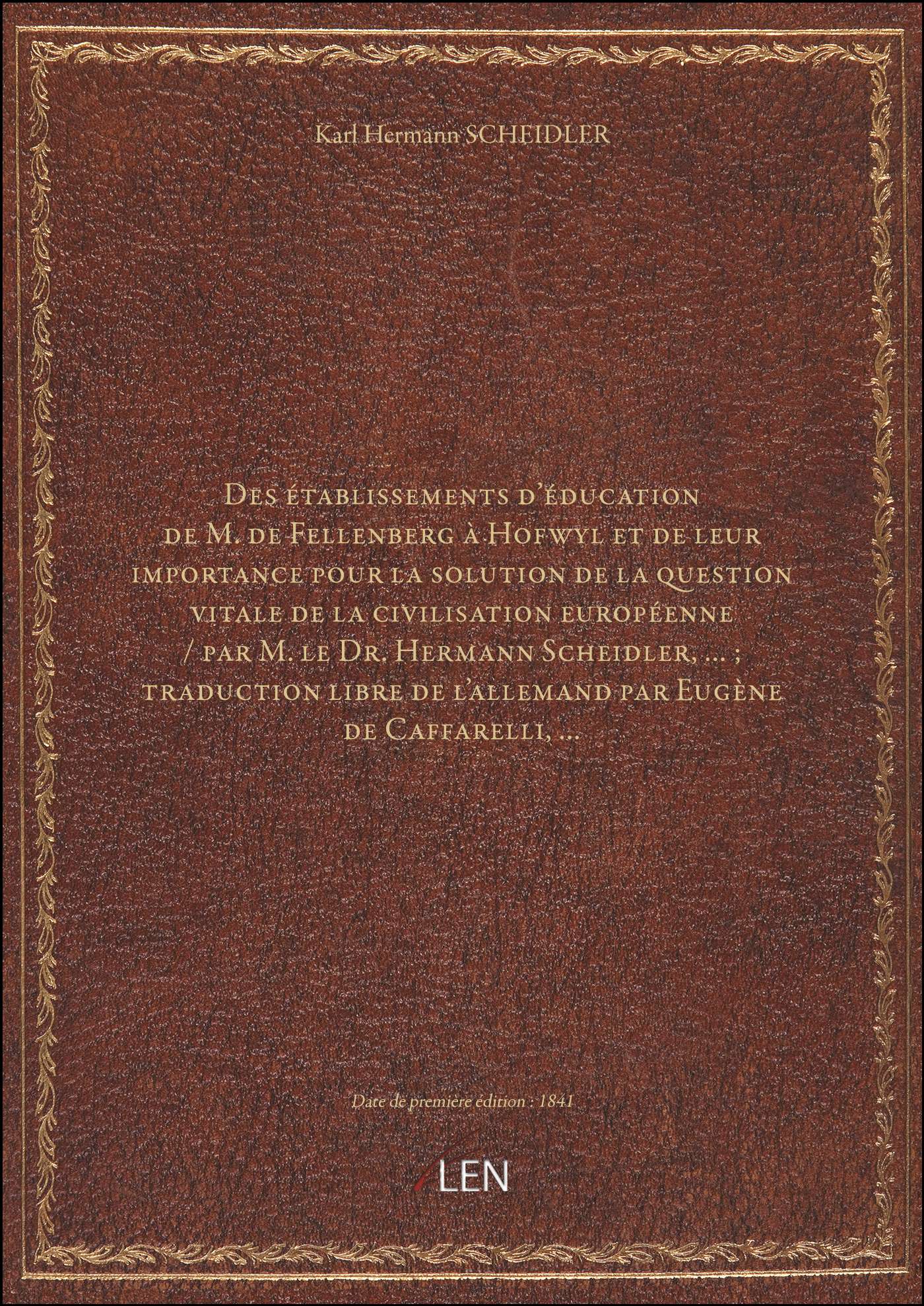 Des établissements d'éducation de M. de Fellenberg à Hofwyl et de leur importance pour la solution de la question vitale de la civilisation européenne / par M. le Dr. Hermann Scheidler,... ; traduction libre de l'allemand par Eugène de Caffarelli,...