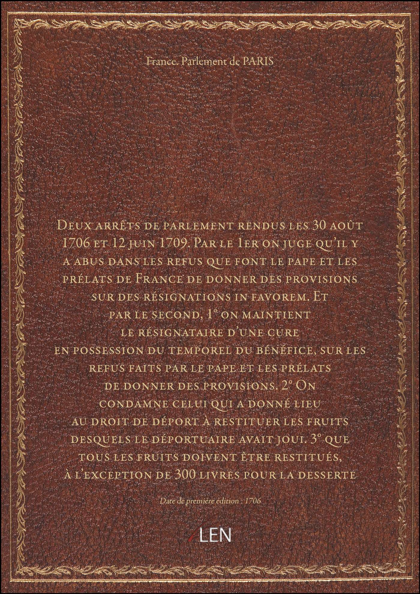 Titre complet : Deux arrêts de parlement rendus les 30 août 1706 et 12 juin 1709. Par le 1er on juge qu'il y a abus dans les refus que font le pape et les prélats de France de donner des provisions sur des résignations in favorem. Et par le second, 1° on maintient le résignataire d'une cure en possession du temporel du bénéfice, sur les refus faits par le pape et les prélats de donner des provisions. 2° On condamne celui qui a donné lieu au droit de déport à restituer les fruits desquels le déportuaire avait joui. 3° que tous les fruits doivent être restitués, à l'exception de 300 livres pour la desserte