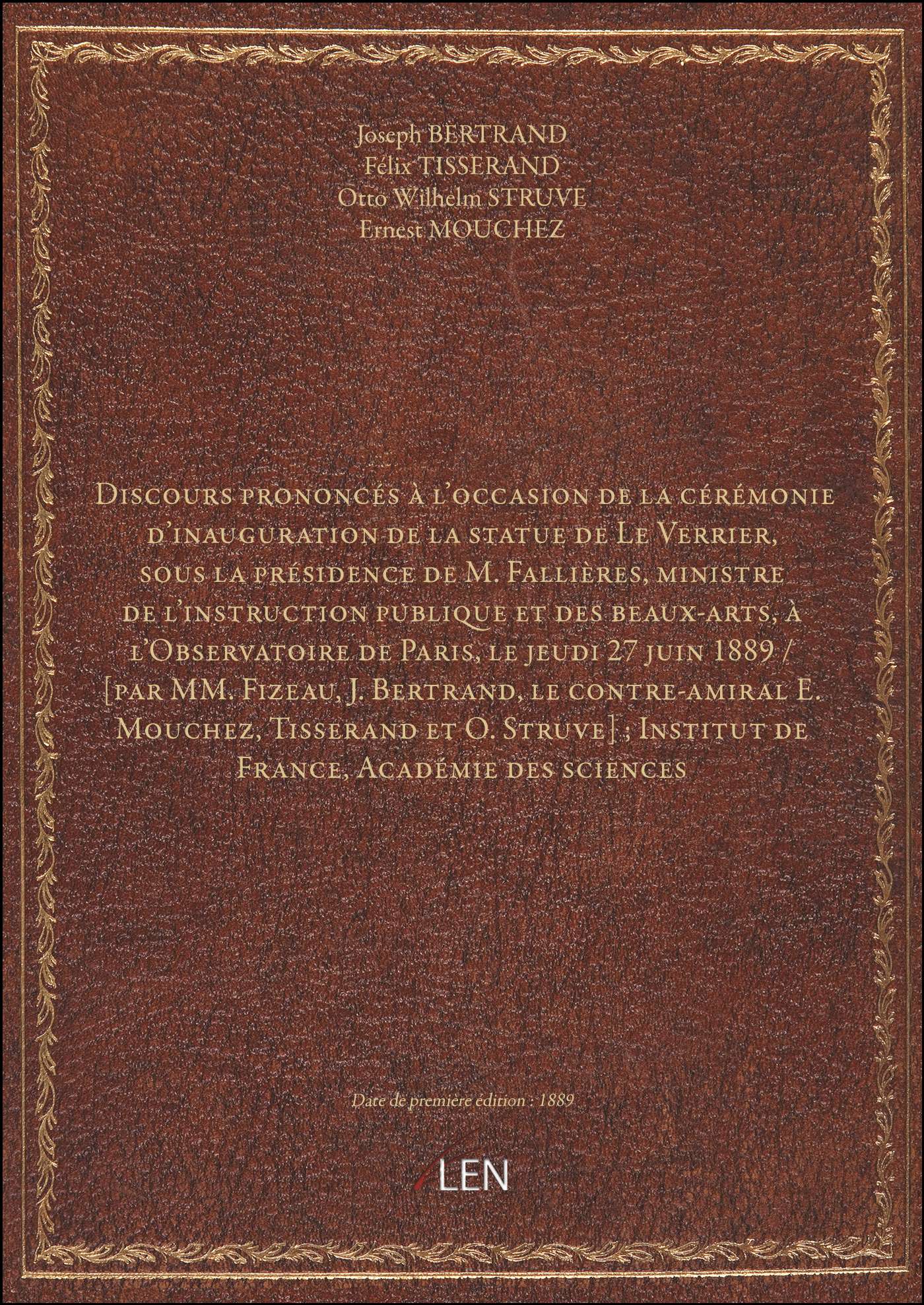 Titre complet : Discours prononcés à l'occasion de la cérémonie d'inauguration de la statue de Le Verrier, sous la présidence de M. Fallières, ministre de l'instruction publique et des beaux-arts, à l'Observatoire de Paris, le jeudi 27 juin 1889 / [par MM. Fizeau, J. Bertrand, le contre-amiral E. Mouchez, Tisserand et O. Struve] ; Institut de France, Académie des sciences