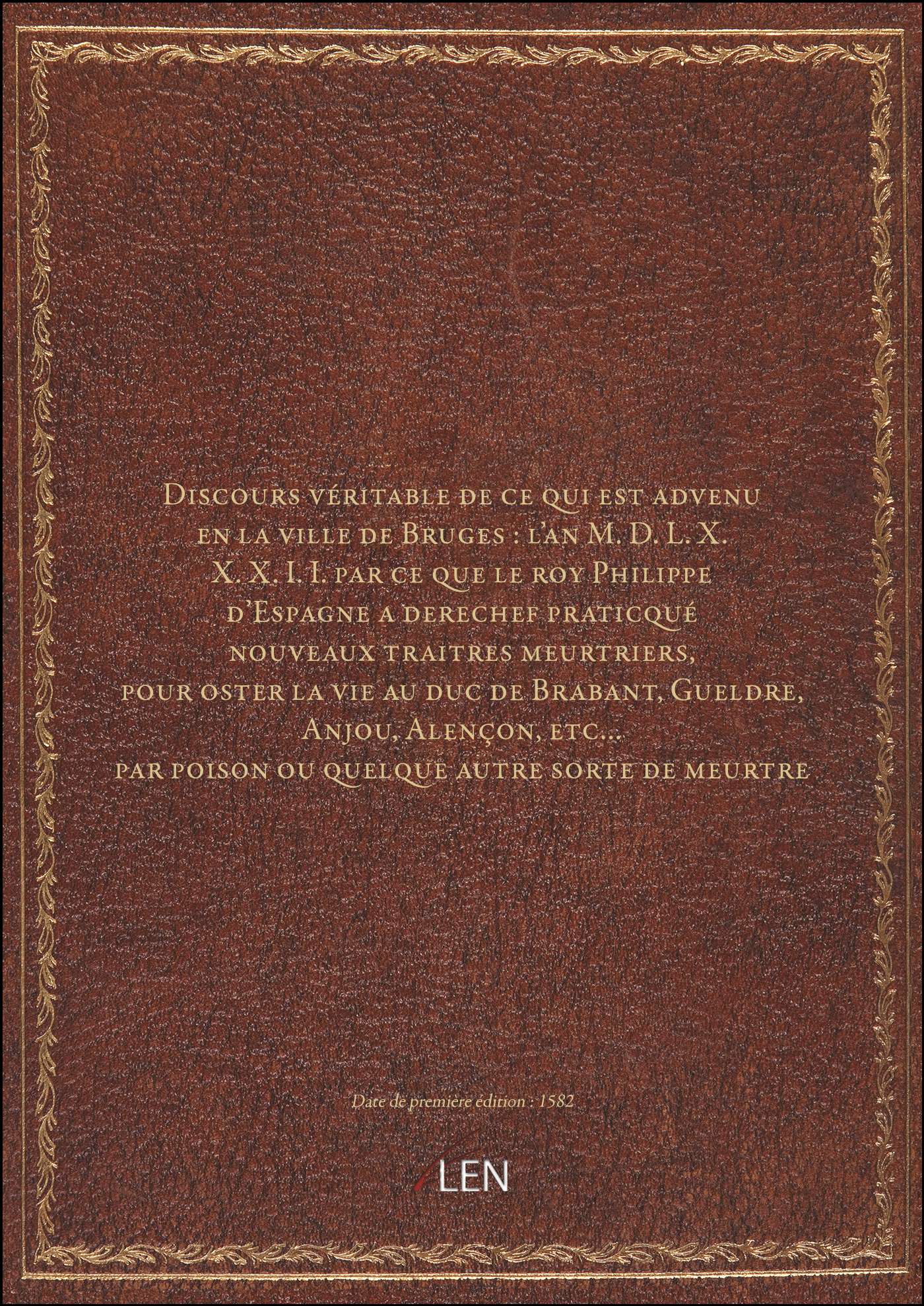 Titre complet : Discours véritable de ce qui est advenu en la ville de Bruges : l'an M.D.L.X.X.X.I.I. par ce que le roy Philippe d'Espagne a derechef praticqué nouveaux traitres meurtriers, pour oster la vie au duc de Brabant, Gueldre, Anjou, Alençon, etc... par poison ou quelque autre sorte de meurtre ([Reprod.])