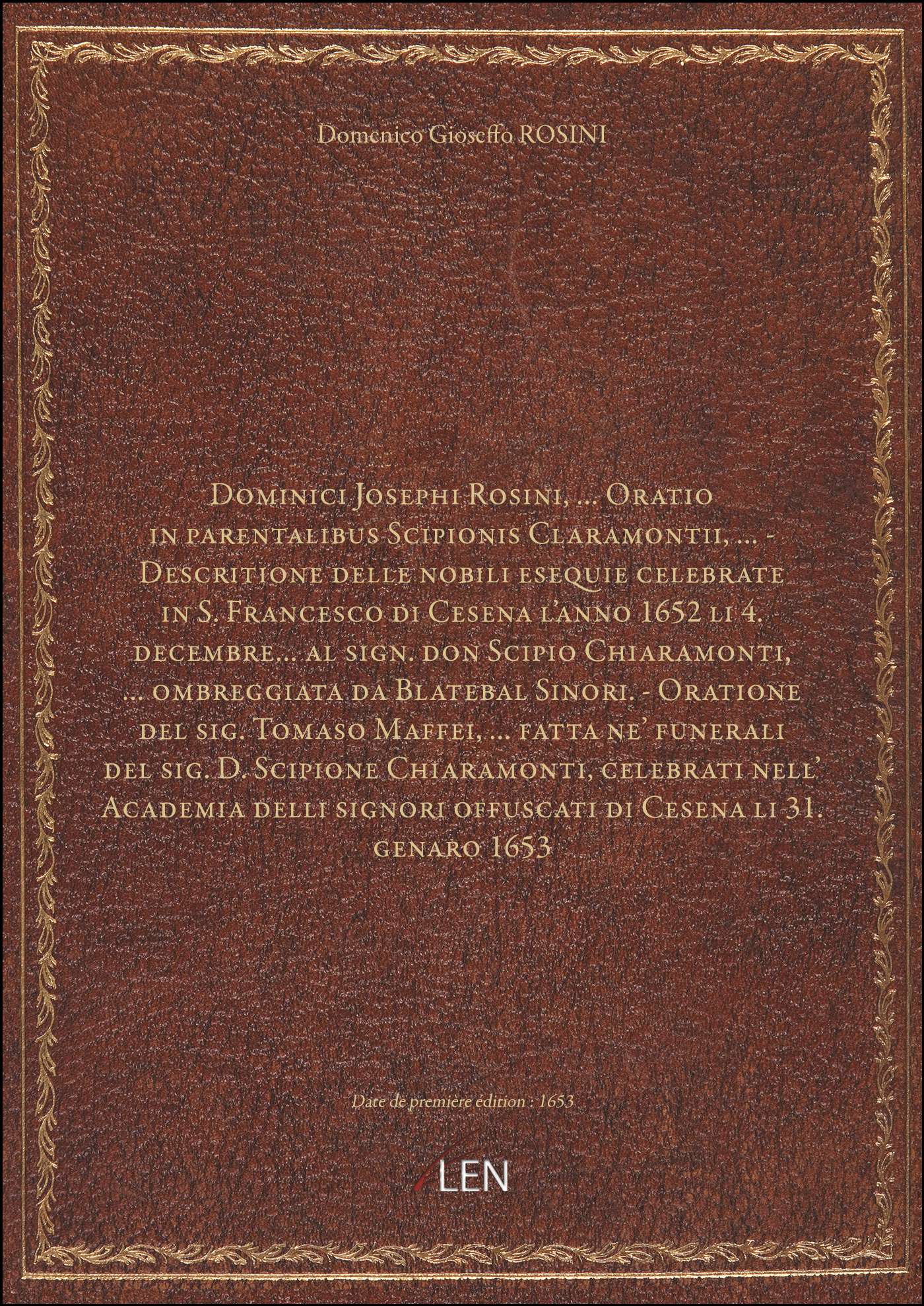 Titre complet : Dominici Josephi Rosini,... Oratio in parentalibus Scipionis Claramontii,... - Descritione delle nobili esequie celebrate in S. Francesco di Cesena l'anno 1652 li 4. decembre... al sign. don Scipio Chiaramonti,... ombreggiata da Blatebal Sinori. - Oratione del sig. Tomaso Maffei,... fatta ne' funerali del sig. D. Scipione Chiaramonti, celebrati nell' Academia delli signori offuscati di Cesena li 31. genaro 1653