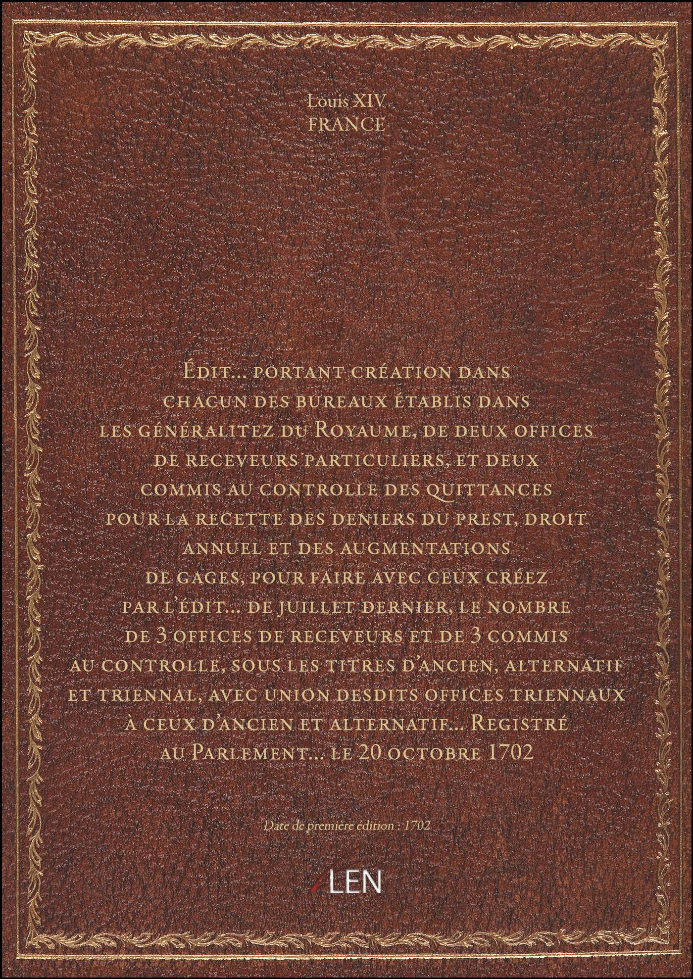 Titre complet : Édit... portant création dans chacun des bureaux établis dans les généralitez du Royaume, de deux offices de receveurs particuliers, et deux commis au controlle des quittances pour la recette des deniers du prest, droit annuel et des augmentations de gages, pour faire avec ceux créez par l'édit... de juillet dernier, le nombre de 3 offices de receveurs et de 3 commis au controlle, sous les titres d'ancien, alternatif et triennal, avec union desdits offices triennaux à ceux d'ancien et alternatif... Registré au Parlement... le 20 octobre 1702