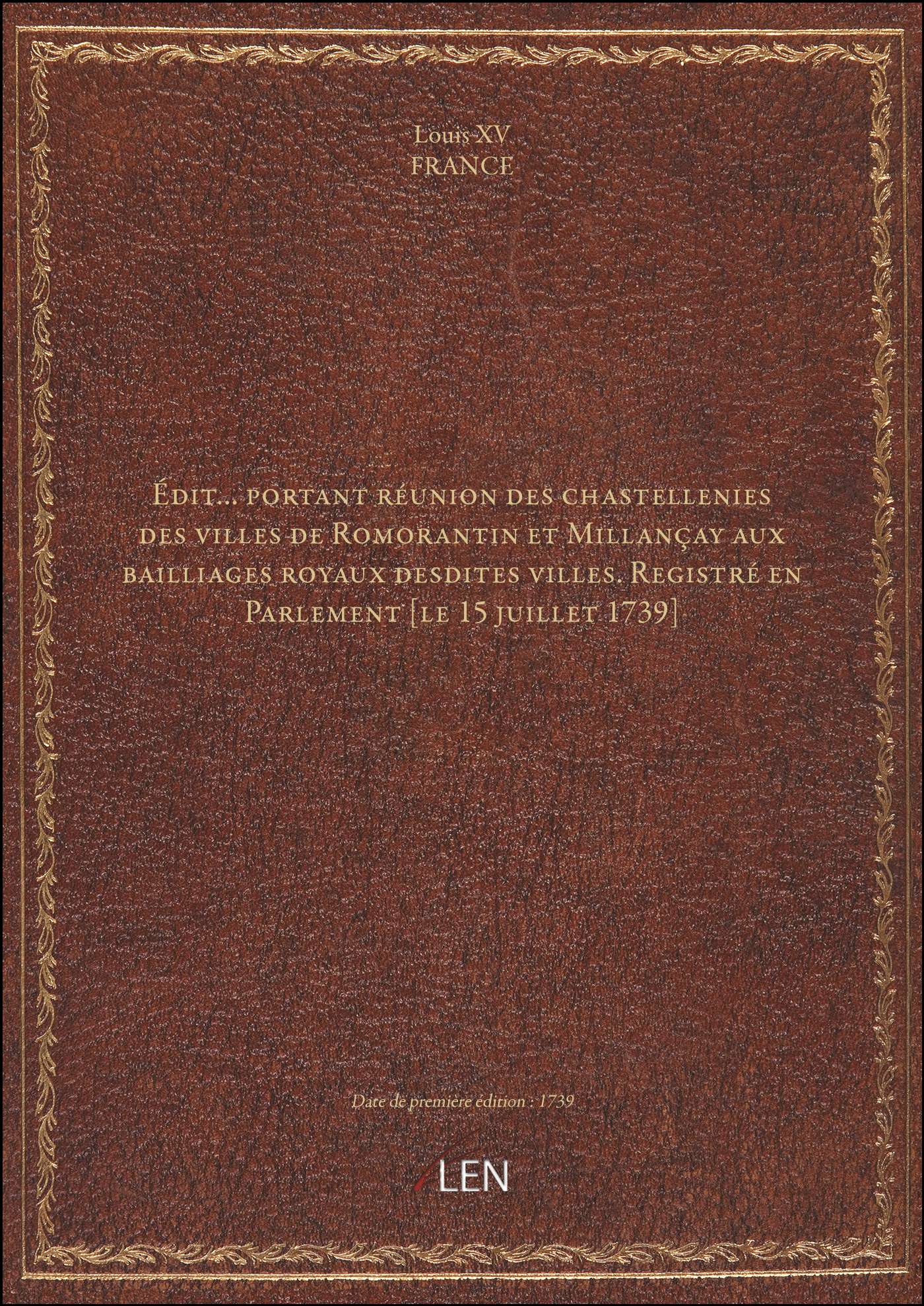 Titre complet : Édit... portant réunion des chastellenies des villes de Romorantin et Millançay aux bailliages royaux desdites villes. Registré en Parlement [le 15 juillet 1739]
