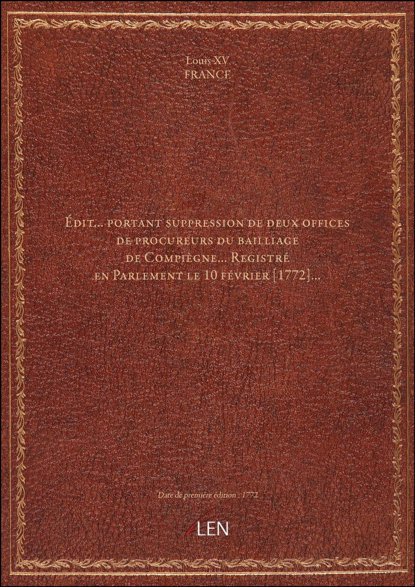 Titre complet : Édit... portant suppression de deux offices de procureurs du bailliage de Compiègne... Registré en Parlement le 10 février [1772]...