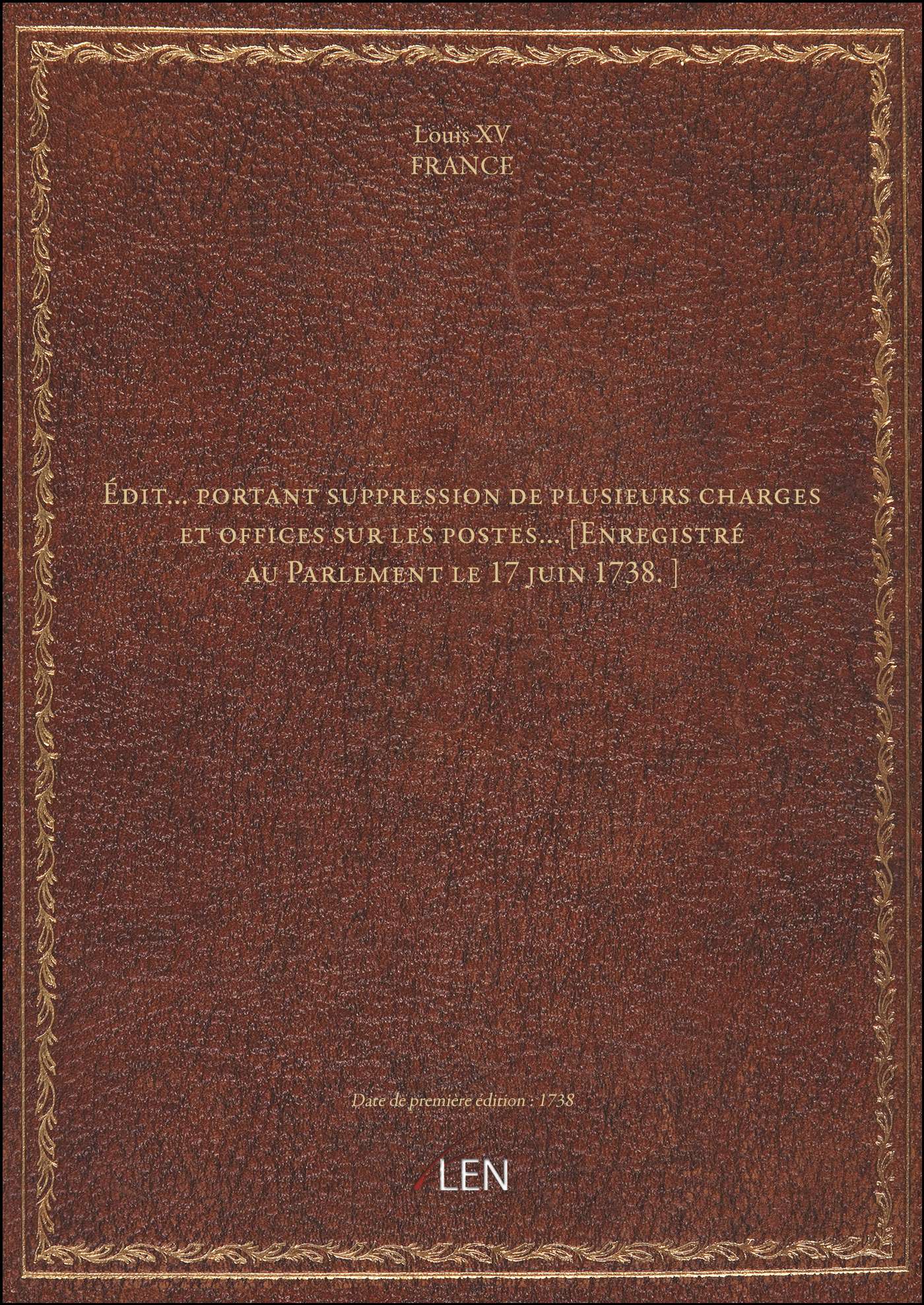 Titre complet : Édit... portant suppression de plusieurs charges et offices sur les postes... [Enregistré au Parlement le 17 juin 1738.]