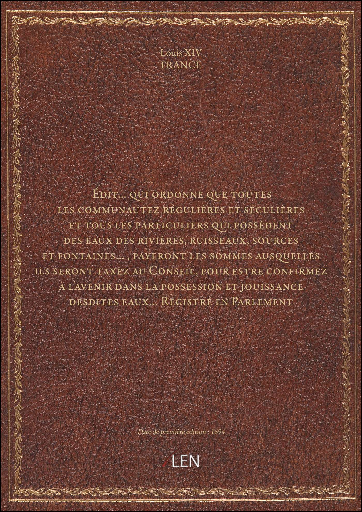Titre complet : Édit... qui ordonne que toutes les communautez régulières et séculières et tous les particuliers qui possèdent des eaux des rivières, ruisseaux, sources et fontaines..., payeront les sommes ausquelles ils seront taxez au Conseil, pour estre confirmez à l'avenir dans la possession et jouissance desdites eaux... Registré en Parlement