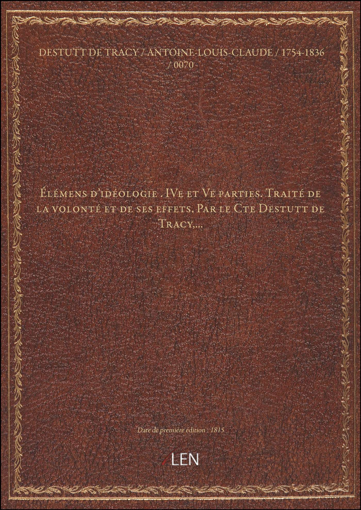 Titre complet : Élémens d'idéologie . IVe et Ve parties. Traité de la volonté et de ses effets. Par le Cte Destutt de Tracy,...