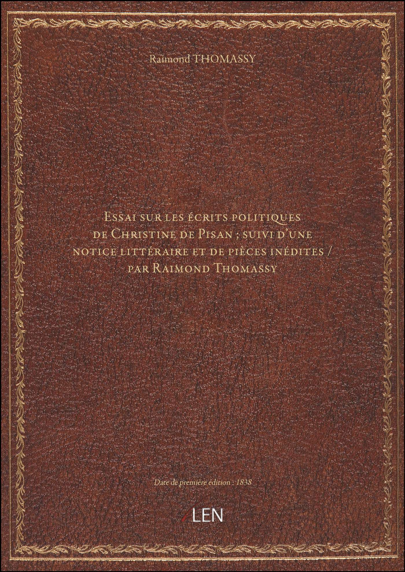 Titre complet : Essai sur les écrits politiques de Christine de Pisan ; suivi d'une notice littéraire et de pièces inédites / par Raimond Thomassy