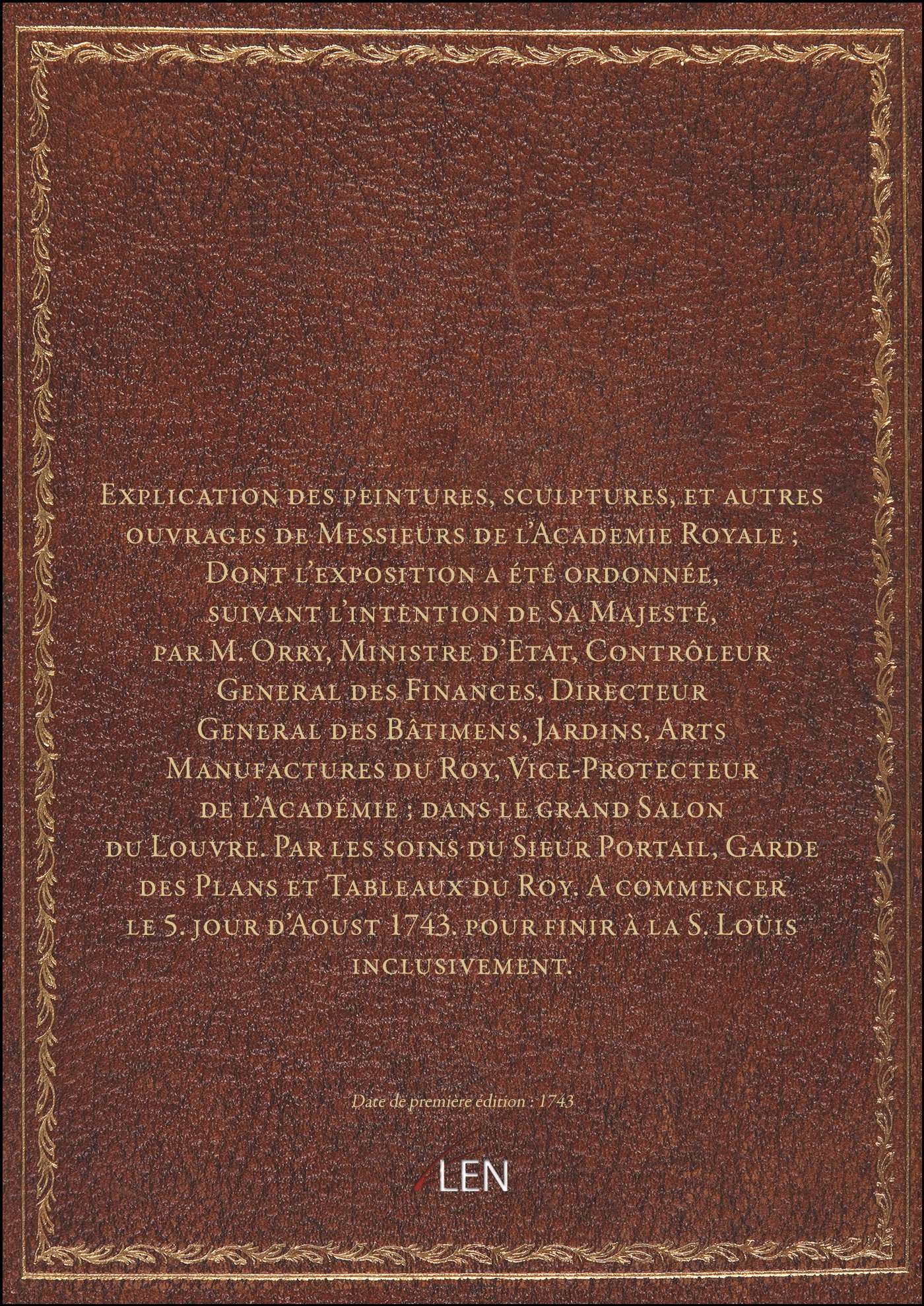 Titre complet : Explication des peintures, sculptures, et autres ouvrages de Messieurs de l'Academie Royale ; Dont l'exposition a été ordonnée, suivant l'intention de Sa Majesté, par M. Orry, Ministre d'Etat, Contrôleur General des Finances, Directeur General des Bâtimens, Jardins, Arts Manufactures du Roy, Vice-Protecteur de l'Académie ; dans le grand Salon du Louvre. Par les soins du Sieur Portail, Garde des Plans et Tableaux du Roy. A commencer le 5. jour d'Aoust 1743. pour finir à la S. Loüis inclusivement .