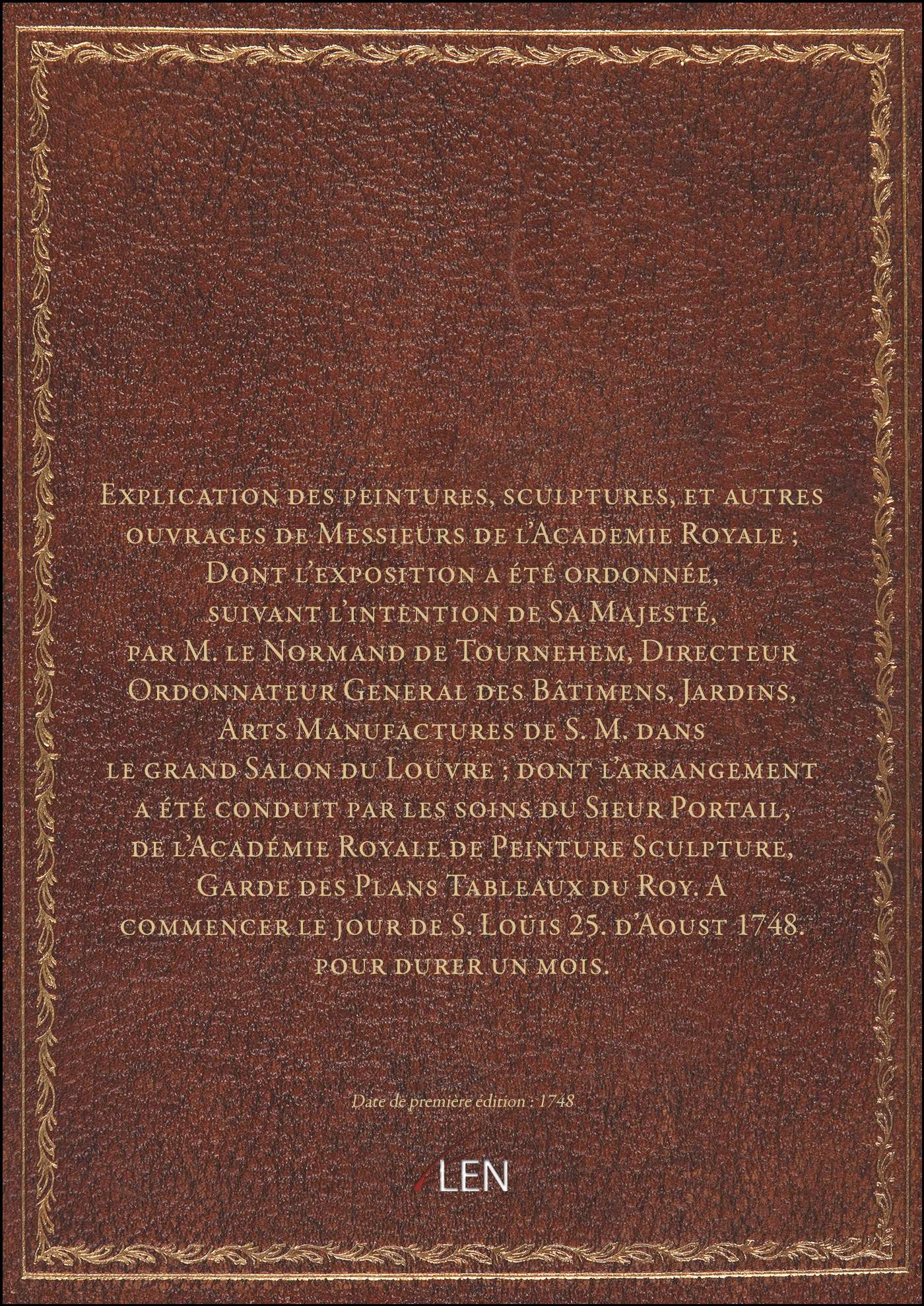 Titre complet : Explication des peintures, sculptures, et autres ouvrages de Messieurs de l'Academie Royale ; Dont l'exposition a été ordonnée, suivant l'intention de Sa Majesté, par M. le Normand de Tournehem, Directeur Ordonnateur General des Bâtimens, Jardins, Arts Manufactures de S. M. dans le grand Salon du Louvre ; dont l'arrangement a été conduit par les soins du Sieur Portail, de l'Académie Royale de Peinture Sculpture, Garde des Plans Tableaux du Roy. A commencer le jour de S. Loüis 25. d'Aoust 1748. pour durer un mois.