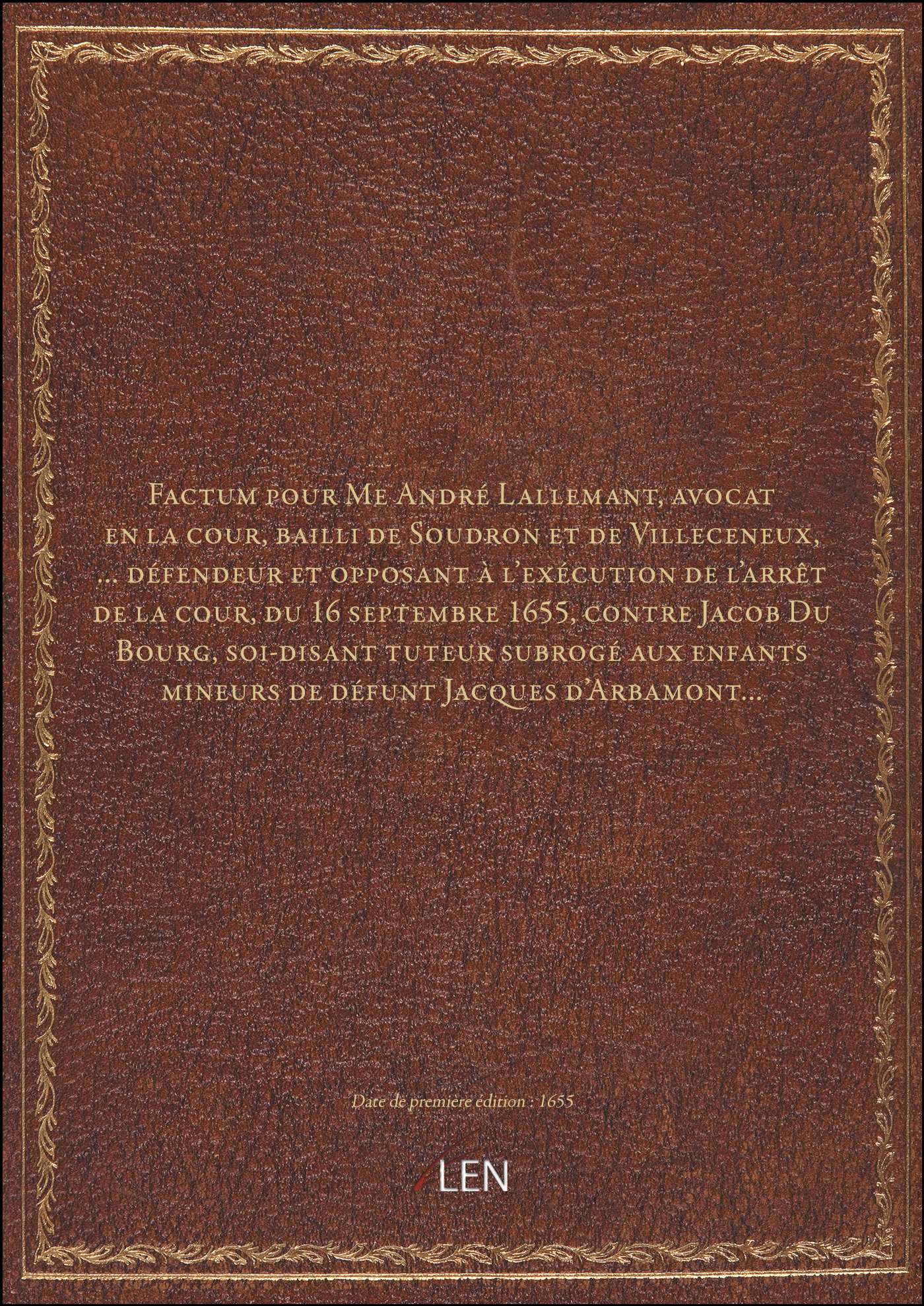 Titre complet : Factum pour Me André Lallemant, avocat en la cour, bailli de Soudron et de Villeceneux,... défendeur et opposant à l'exécution de l'arrêt de la cour, du 16 septembre 1655, contre Jacob Du Bourg, soi-disant tuteur subrogé aux enfants mineurs de défunt Jacques d'Arbamont...
