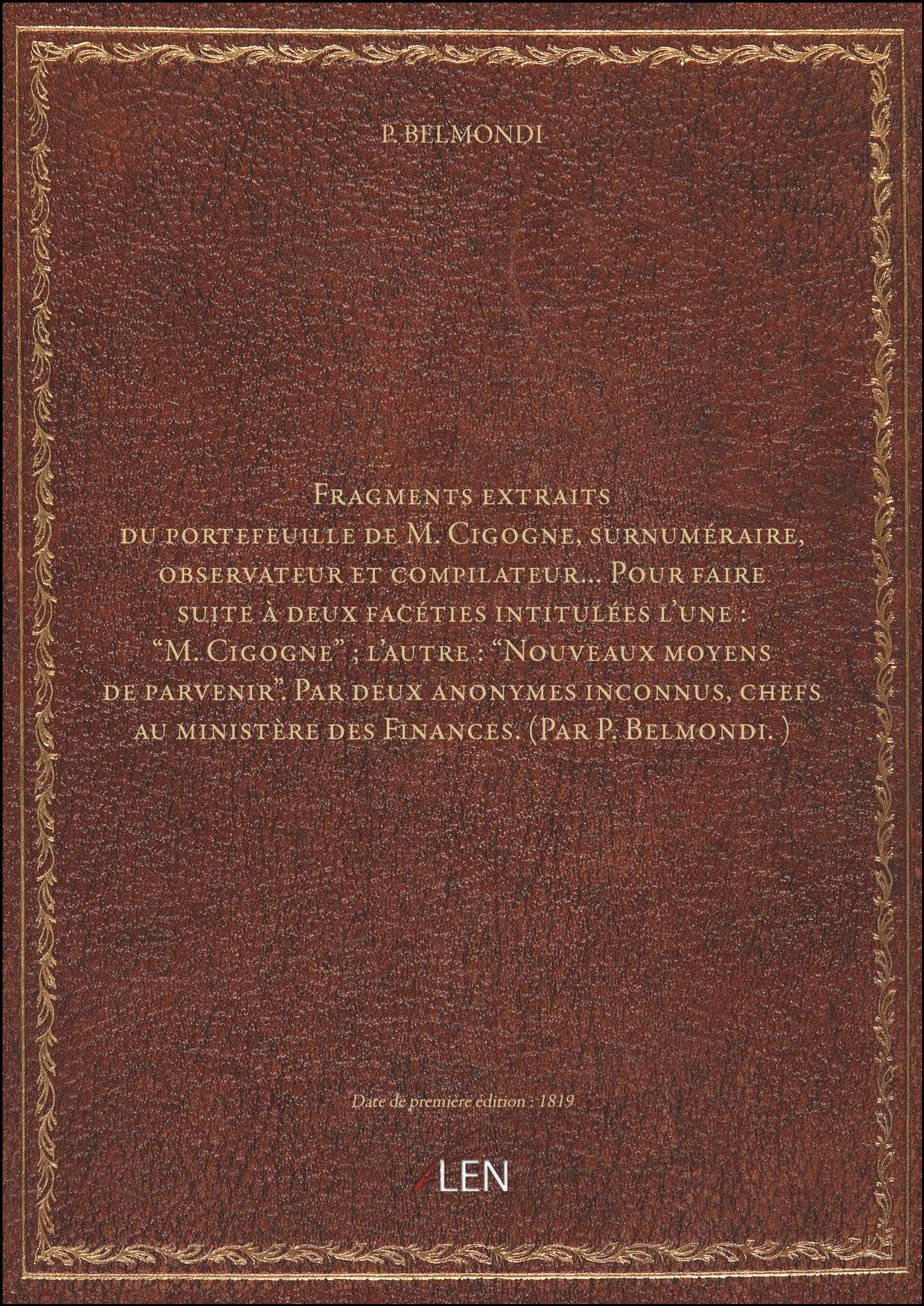 Titre complet : Fragments extraits du portefeuille de M. Cigogne, surnuméraire, observateur et compilateur... Pour faire suite à deux facéties intitulées l'une : "M. Cigogne" ; l'autre : "Nouveaux moyens de parvenir". Par deux anonymes inconnus, chefs au ministère des Finances. (Par P. Belmondi.)