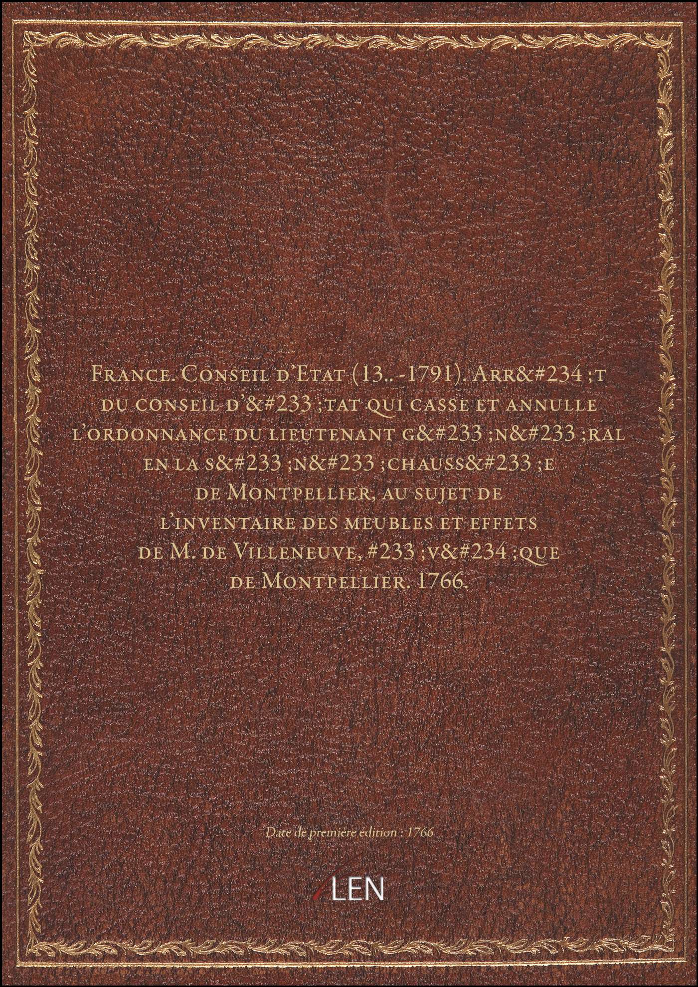 Titre complet : France. Conseil d'Etat (13..-1791). Arrêt du conseil d'état qui casse et annulle l'ordonnance du lieutenant général en la sénéchaussée de Montpellier, au sujet de l'inventaire des meubles et effets de M. de Villeneuve, Evêque de Montpellier. 1766.