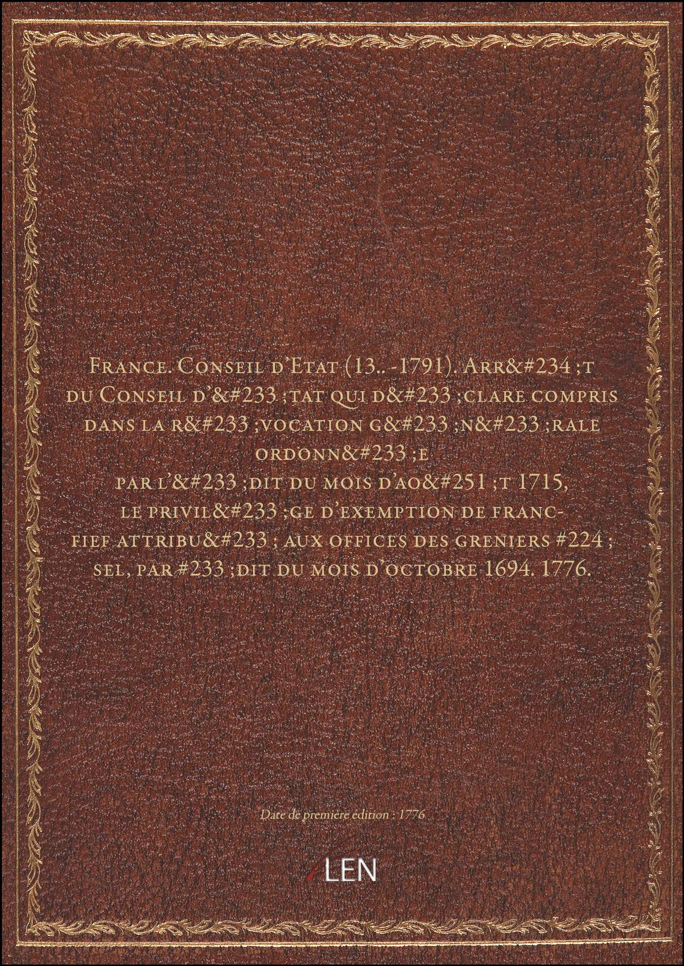 Titre complet : France. Conseil d'Etat (13..-1791). Arrêt du Conseil d'état qui déclare compris dans la révocation générale ordonnée par l'édit du mois d'août 1715, le privilége d'exemption de franc-fief attribué aux offices des greniers à sel, par Edit du mois d'octobre 1694. 1776.