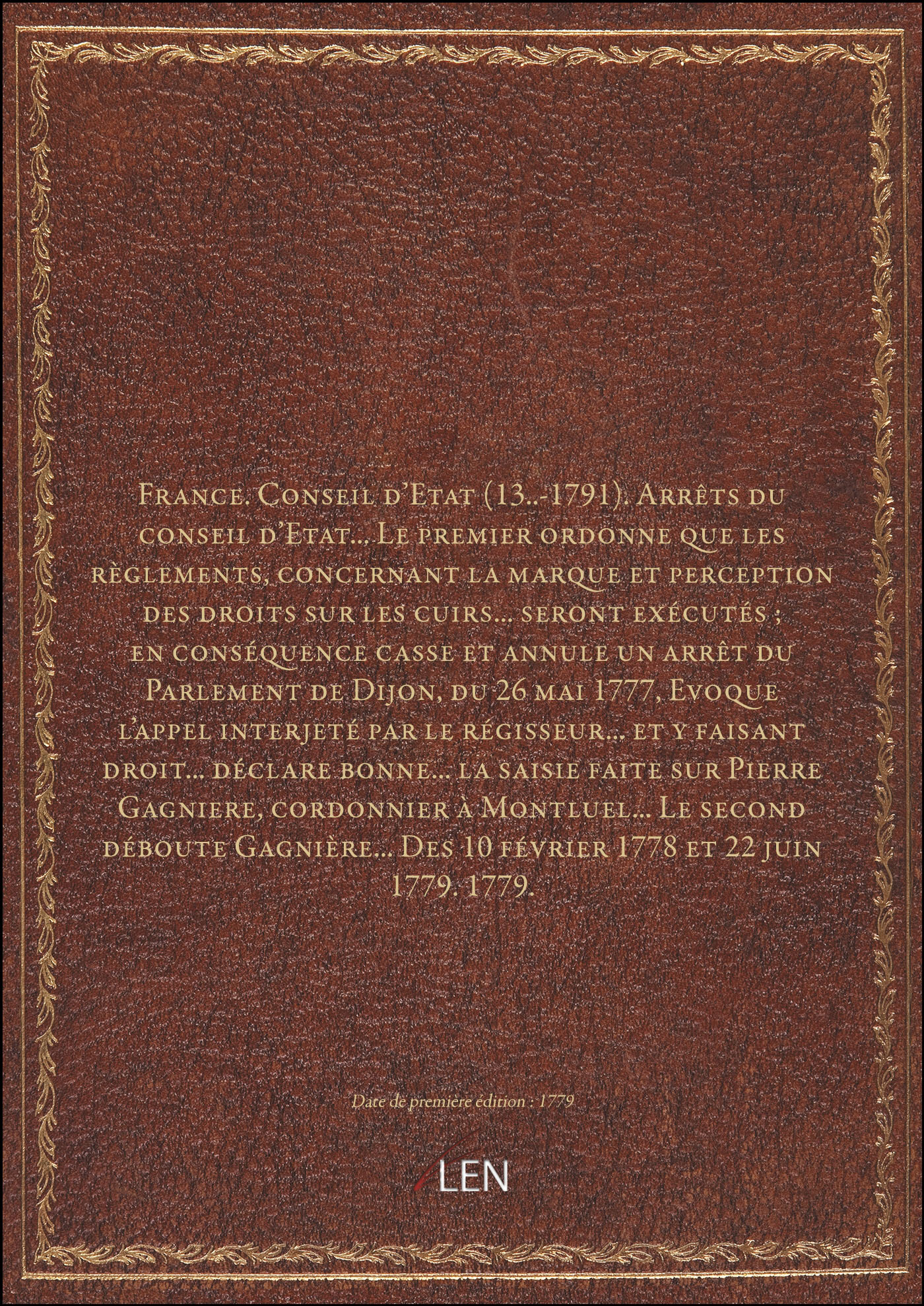 Titre complet : France. Conseil d'Etat (13..-1791). Arrêts du conseil d'Etat... Le premier ordonne que les règlements, concernant la marque et perception des droits sur les cuirs... seront exécutés ; en conséquence casse et annule un arrêt du Parlement de Dijon, du 26 mai 1777, Evoque l'appel interjeté par le régisseur... et y faisant droit... déclare bonne... la saisie faite sur Pierre Gagniere, cordonnier à Montluel... Le second déboute Gagnière... Des 10 février 1778 et 22 juin 1779. 1779.