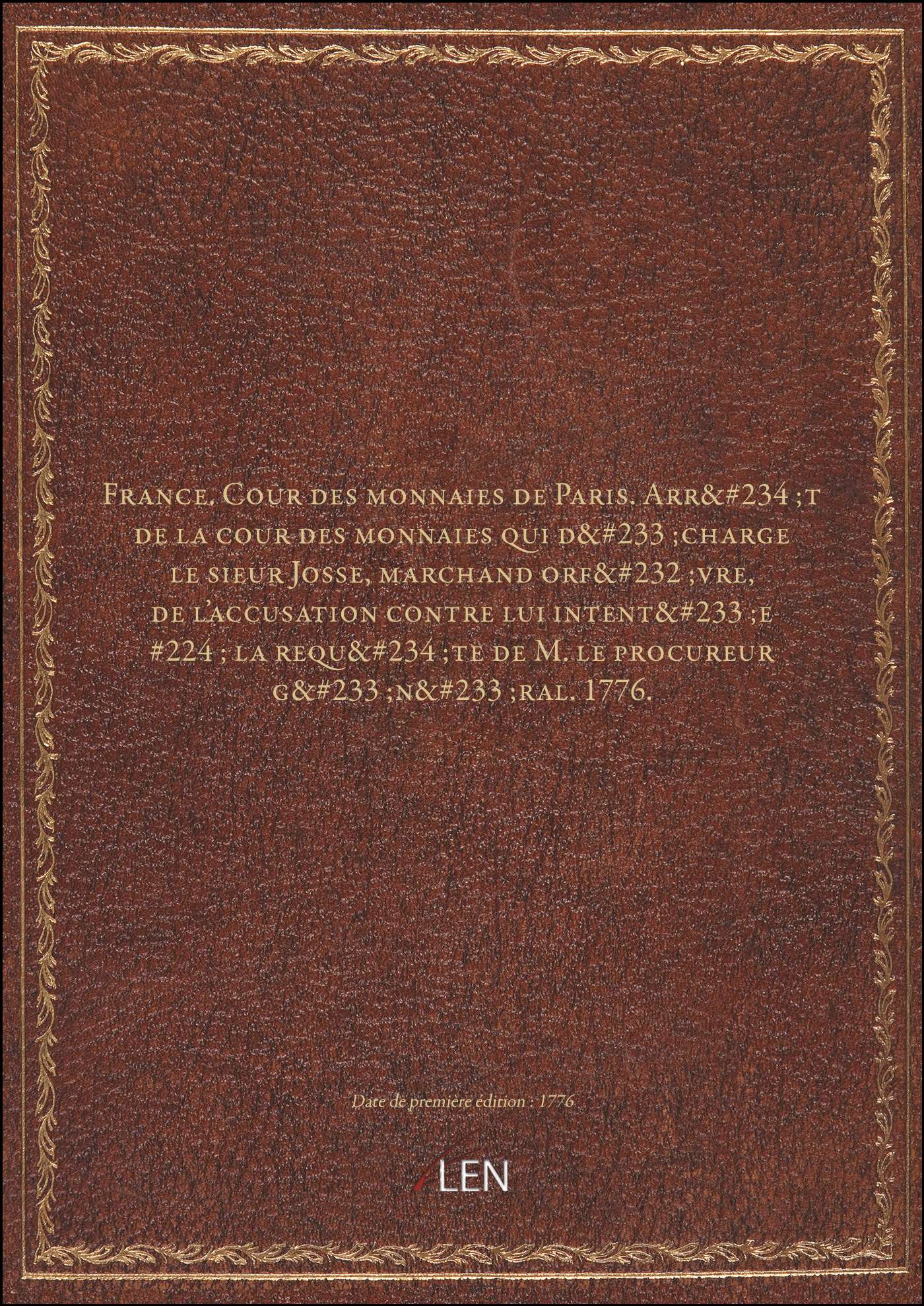 Titre complet : France. Cour des monnaies de Paris. Arrêt de la cour des monnaies qui décharge le sieur Josse, marchand orfèvre, de l'accusation contre lui intentée à la requête de M. le procureur général. 1776.