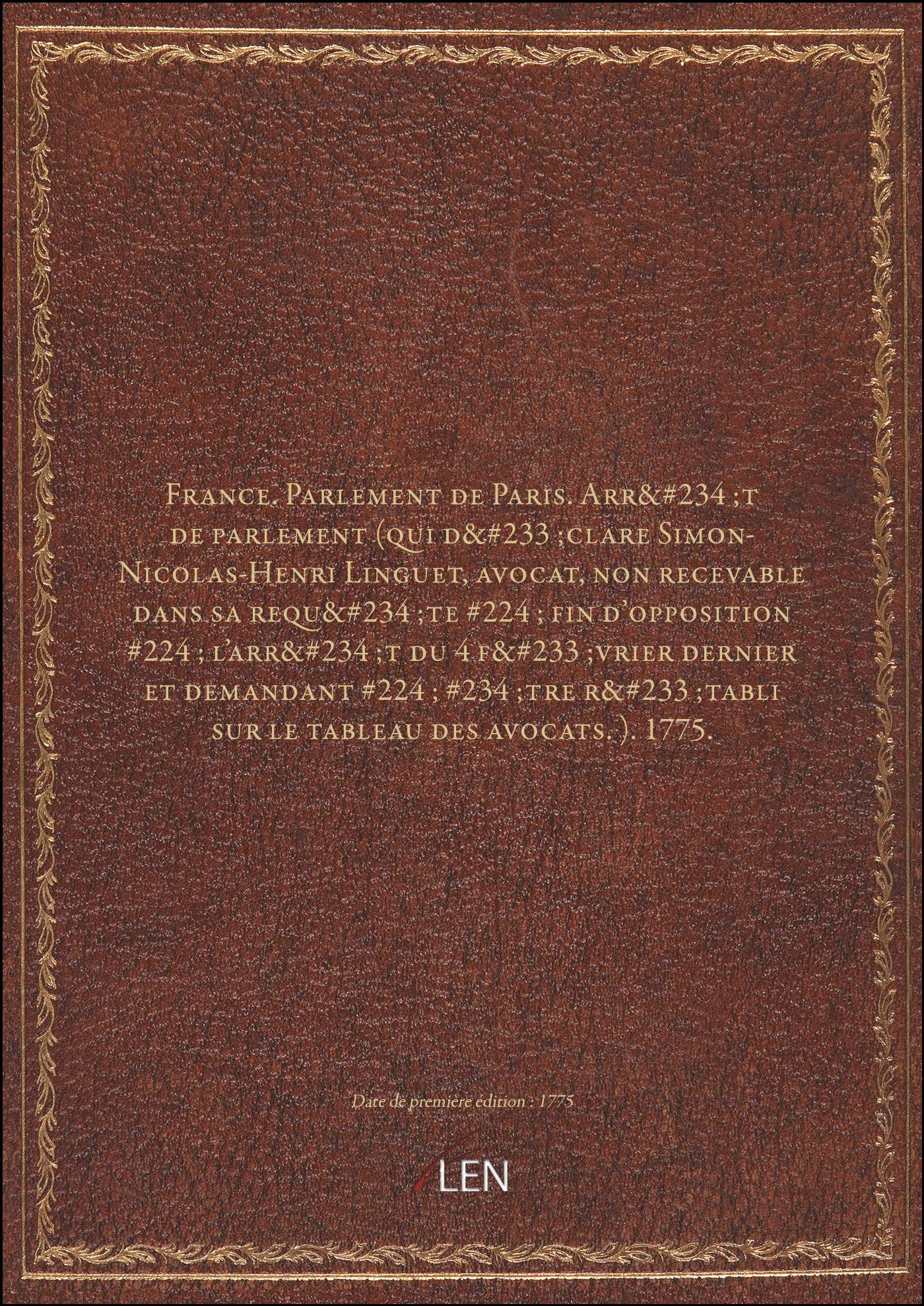 Titre complet : France. Parlement de Paris. Arrêt de parlement (qui déclare Simon-Nicolas-Henri Linguet, avocat, non recevable dans sa requête à fin d'opposition à l'arrêt du 4 février dernier et demandant à être rétabli sur le tableau des avocats.). 1775.