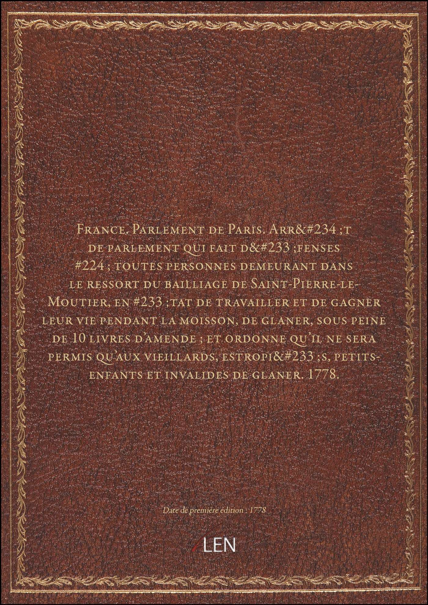 Titre complet : France. Parlement de Paris. Arrêt de parlement qui fait défenses à toutes personnes demeurant dans le ressort du bailliage de Saint-Pierre-le-Moutier, en Etat de travailler et de gagner leur vie pendant la moisson, de glaner, sous peine de 10 livres d'amende ; et ordonne qu'il ne sera permis qu'aux vieillards, estropiés, petits-enfants et invalides de glaner. 1778.