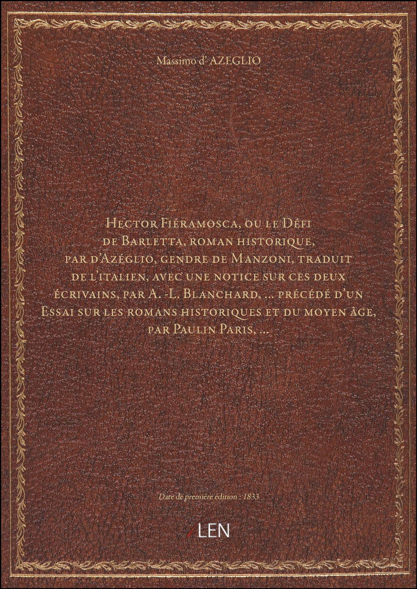 Titre complet : Hector Fiéramosca, ou le Défi de Barletta , roman historique, par d'Azéglio, gendre de Manzoni, traduit de l'italien, avec une notice sur ces deux écrivains, par A.-L. Blanchard,... précédé d'un Essai sur les romans historiques et du moyen âge, par Paulin Paris,...