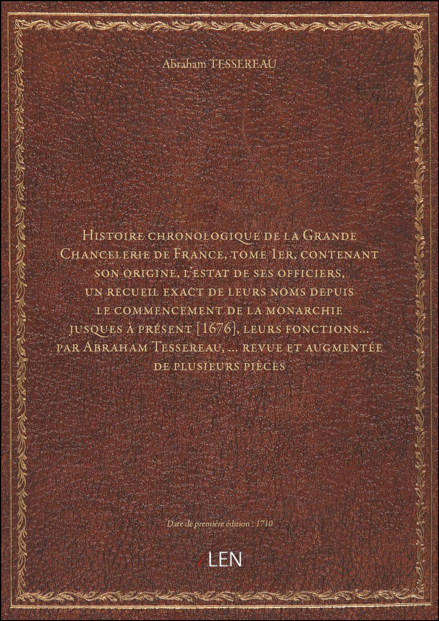 Titre complet : Histoire chronologique de la Grande Chancelerie de France , tome 1er, contenant son origine, l'estat de ses officiers, un recueil exact de leurs noms depuis le commencement de la monarchie jusques à présent [1676], leurs fonctions... par Abraham Tessereau,... revue et augmentée de plusieurs pièces