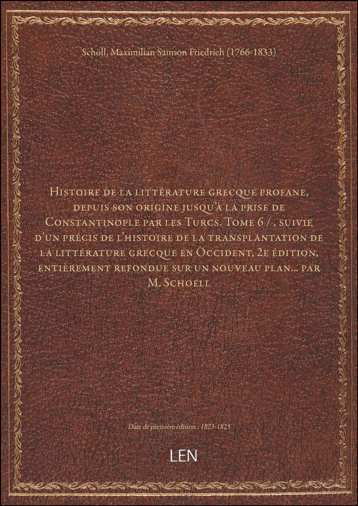 Titre complet : Histoire de la littérature grecque profane, depuis son origine jusqu'à la prise de Constantinople par les Turcs. Tome 6 / , suivie d'un précis de l'histoire de la transplantation de la littérature grecque en Occident, 2e édition, entièrement refondue sur un nouveau plan... par M. Schoell