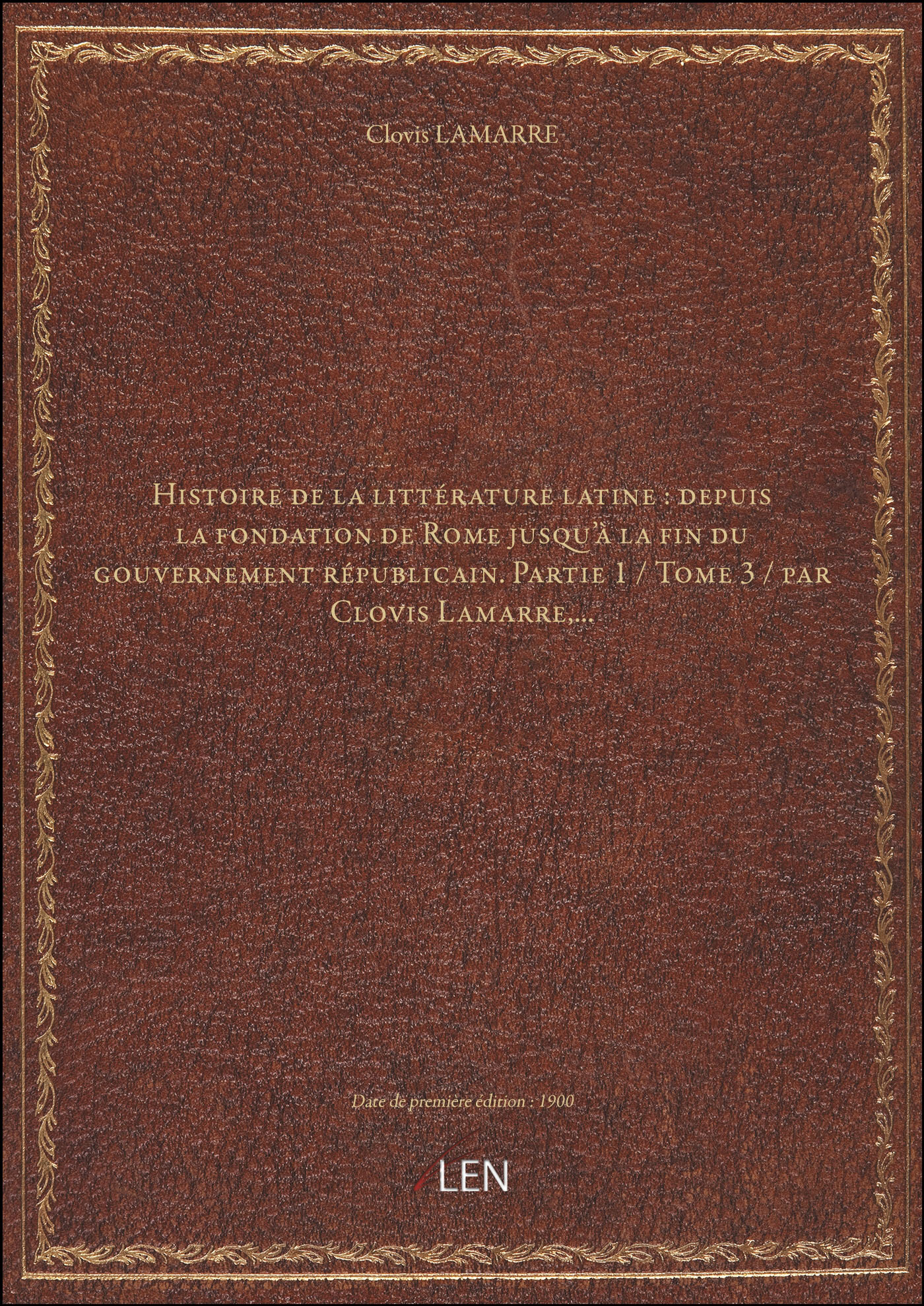 Titre complet : Histoire de la littérature latine : depuis la fondation de Rome jusqu'à la fin du gouvernement républicain. Partie 1 / Tome 3 / par Clovis Lamarre,...