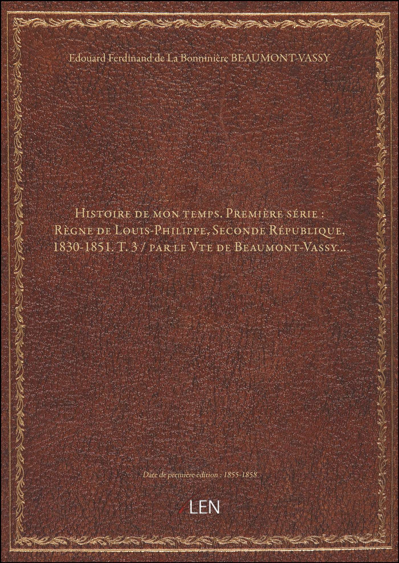 Titre complet : Histoire de mon temps. Première série : Règne de Louis-Philippe, Seconde République, 1830-1851. T. 3 / par le Vte de Beaumont-Vassy...