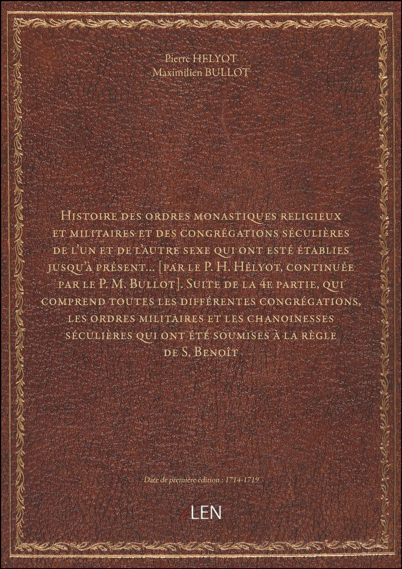 Titre complet : Histoire des ordres monastiques religieux et militaires et des congrégations séculières de l'un et de l'autre sexe qui ont esté établies jusqu'à présent... [par le P. H. Hélyot, continuée par le P. M. Bullot]. Suite de la 4e partie, qui comprend toutes les différentes congrégations, les ordres militaires et les chanoinesses séculières qui ont été soumises à la règle de S. Benoît