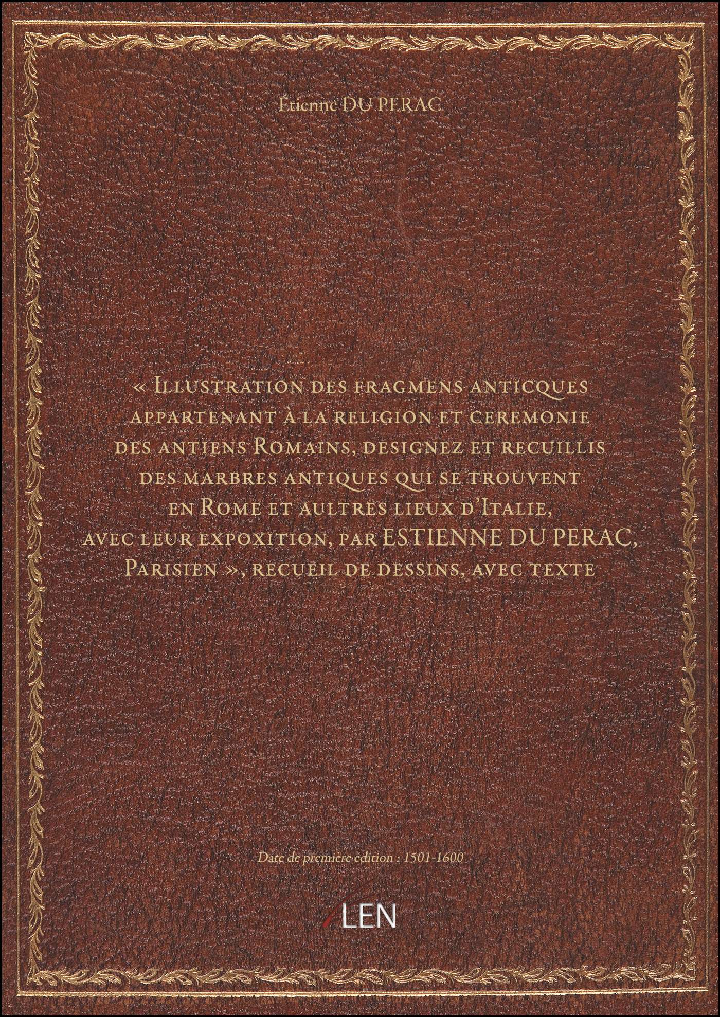 « Illustration des fragmens anticques appartenant à la religion et ceremonie des antiens Romains, designez et recuillis des marbres antiques qui se trouvent en Rome et aultres lieux d'Italie, avec leur expoxition, par ESTIENNE DU PERAC, Parisien », [...]