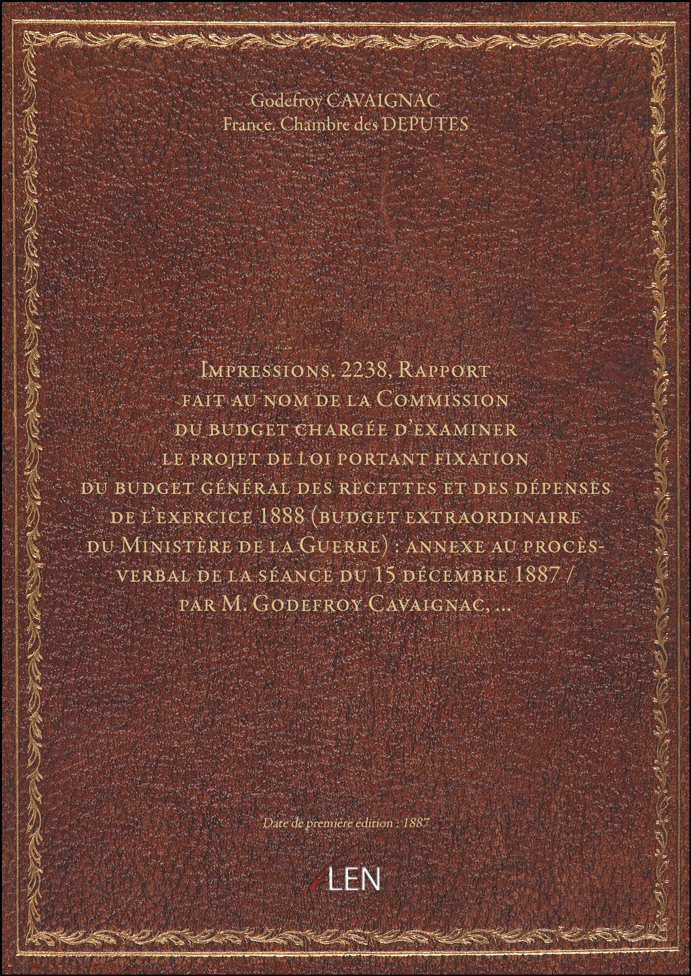 Titre complet : Impressions. 2238, Rapport fait au nom de la Commission du budget chargée d'examiner le projet de loi portant fixation du budget général des recettes et des dépenses de l'exercice 1888 (budget extraordinaire du Ministère de la Guerre) : annexe au procès-verbal de la séance du 15 décembre 1887 / par M. Godefroy Cavaignac,...