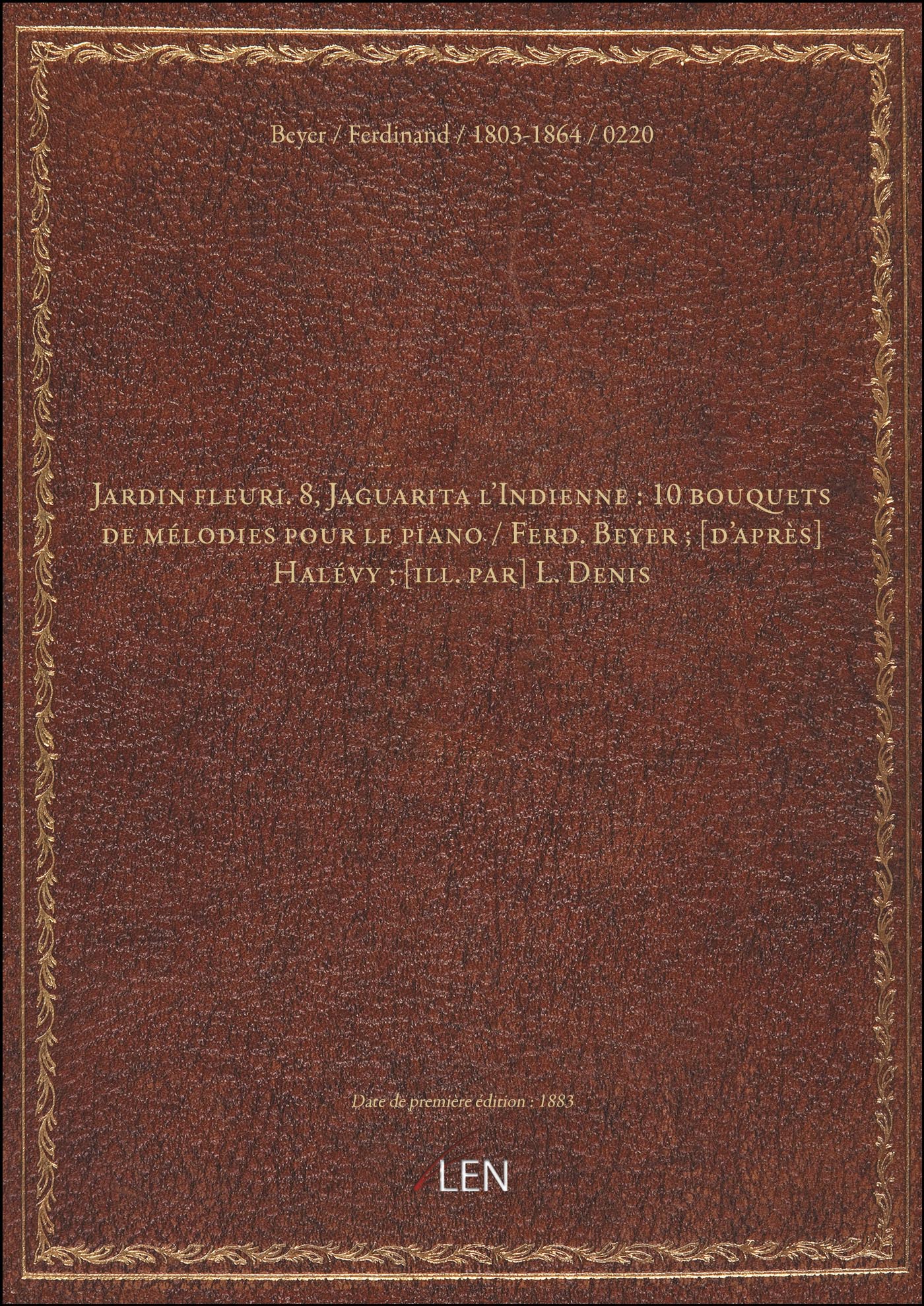 Titre complet : Jardin fleuri. 8, Jaguarita l'Indienne : 10 bouquets de mélodies pour le piano / Ferd. Beyer ; [d'après] Halévy ; [ill. par] L. Denis