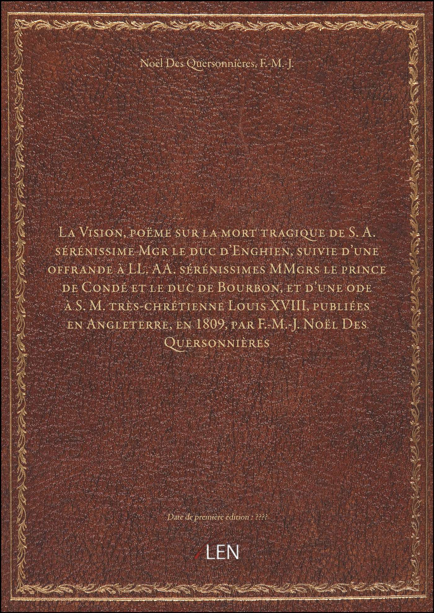 Titre complet : La Vision, poëme sur la mort tragique de S. A. sérénissime Mgr le duc d'Enghien, suivie d'une offrande à LL. AA. sérénissimes MMgrs le prince de Condé et le duc de Bourbon, et d'une ode à S. M. très-chrétienne Louis XVIII, publiées en Angleterre, en 1809, par F.-M.-J. Noël Des Quersonnières